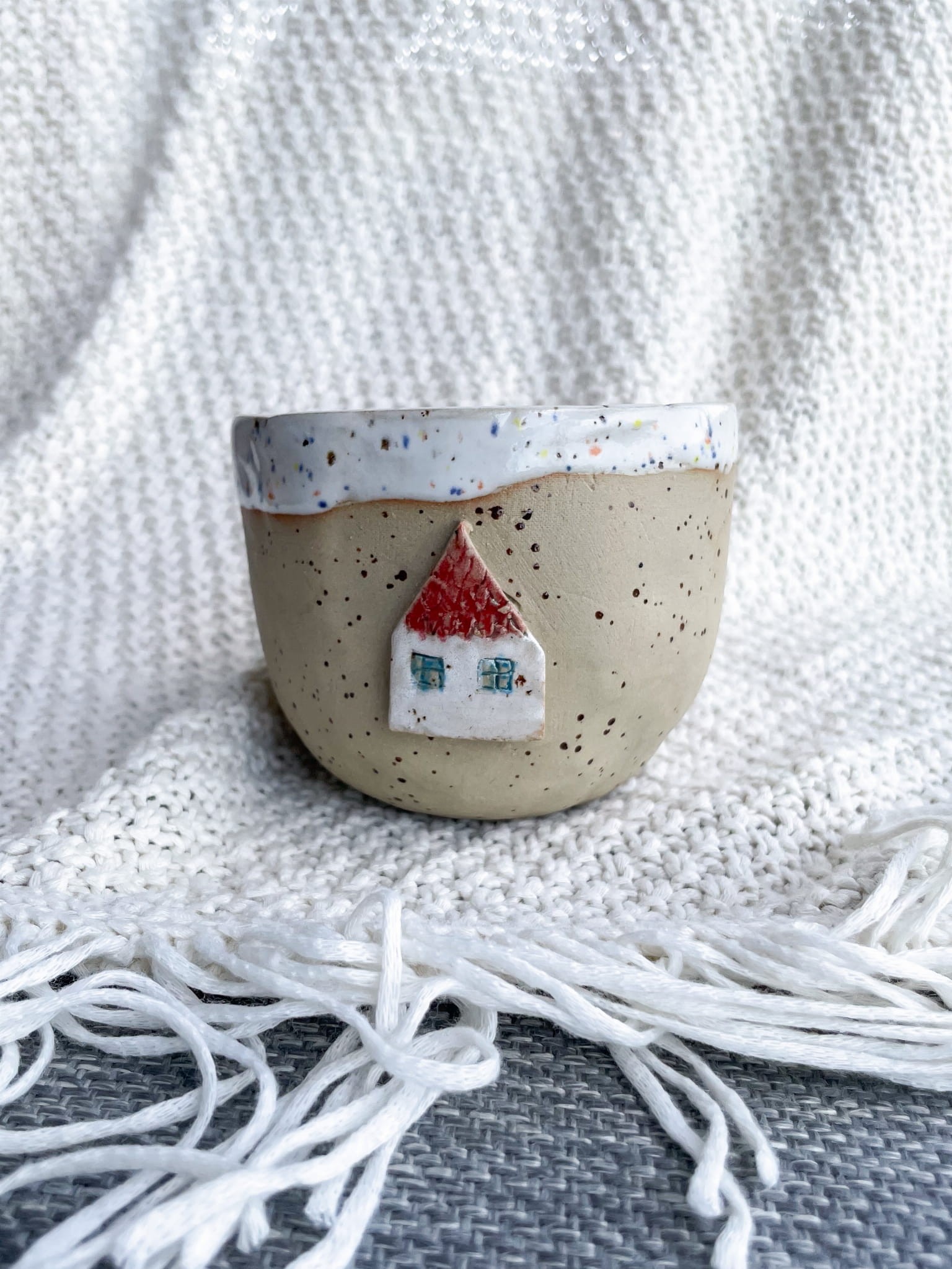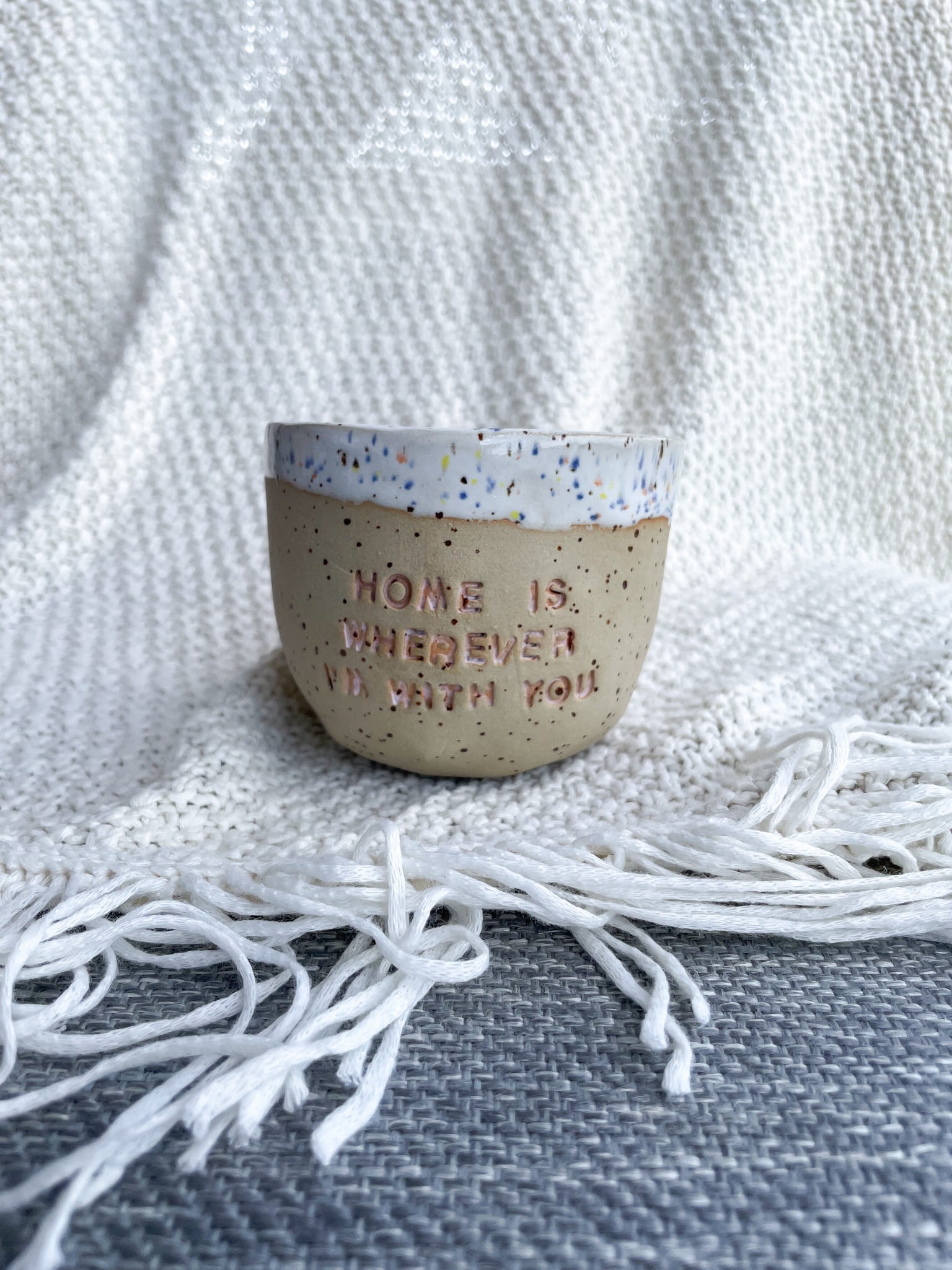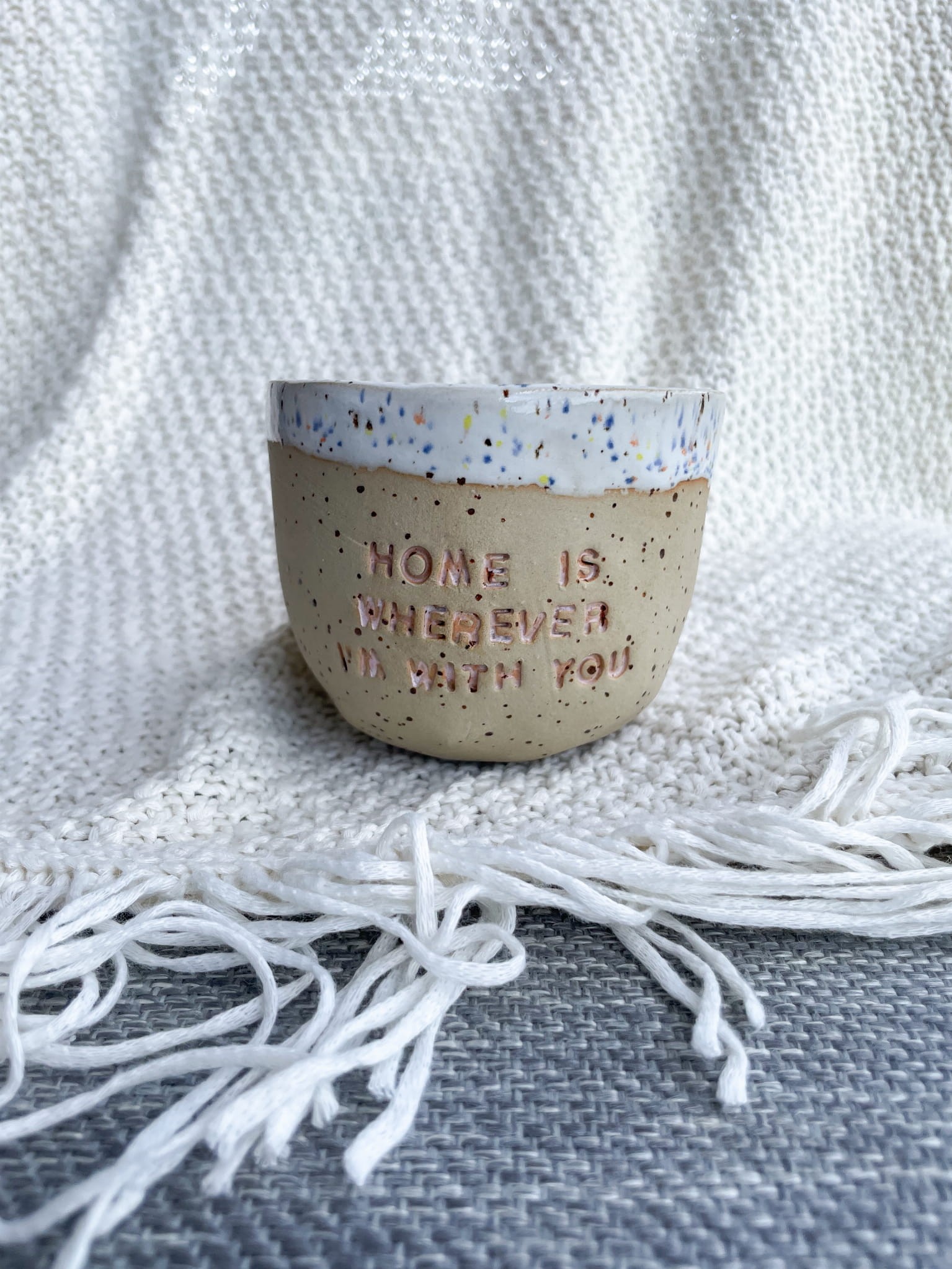 Kubek „Home is wherever I’m with you” to nie tylko ceramika – to małe wyznanie miłości zamknięte w glinie. Naturalna, nakrapiana faktura w połączeniu z białym szkliwem przypominającym posypkę z kolorowych drobinek tworzy naczynie, które emanuje ciepłem i spokojem.