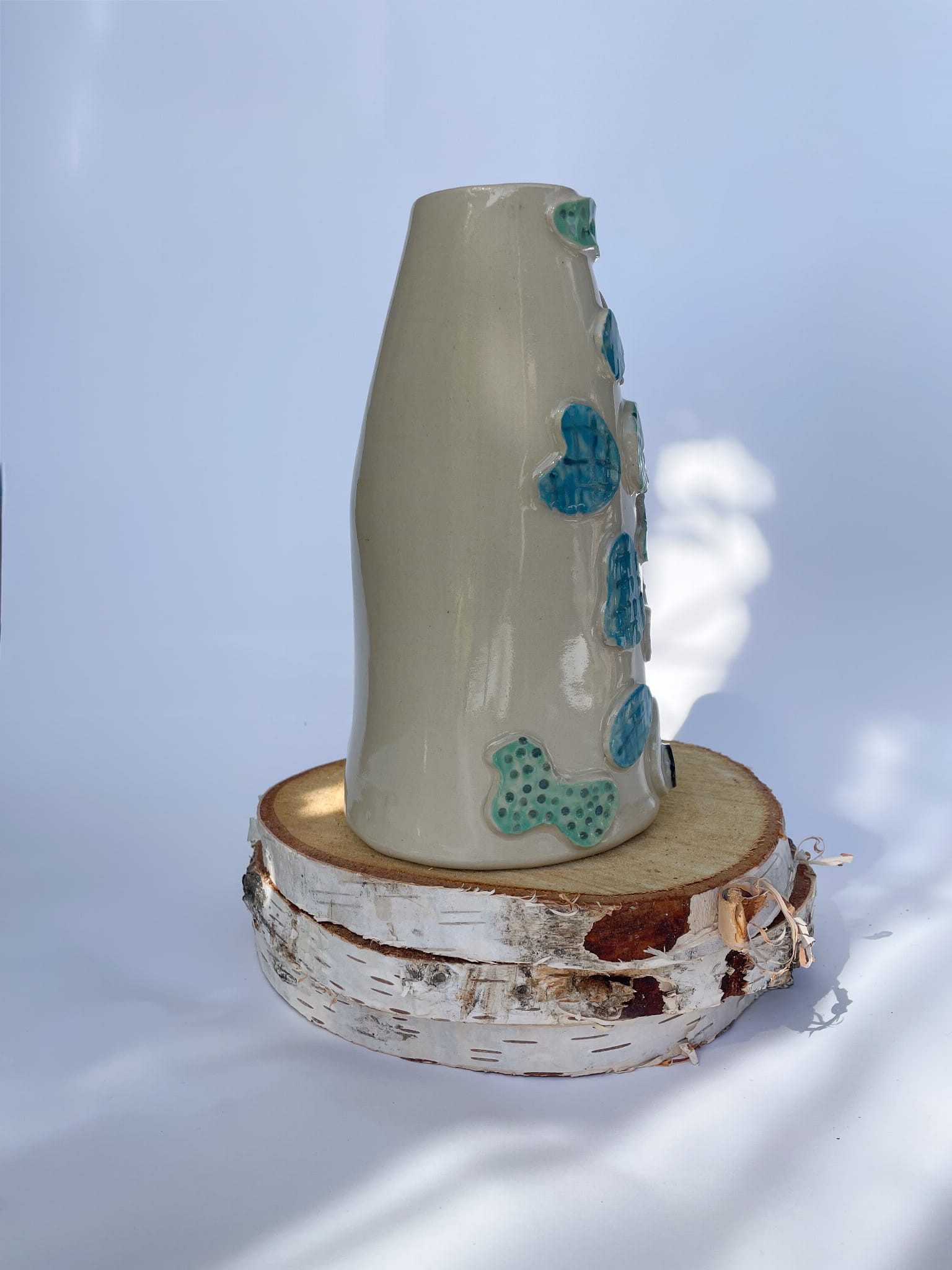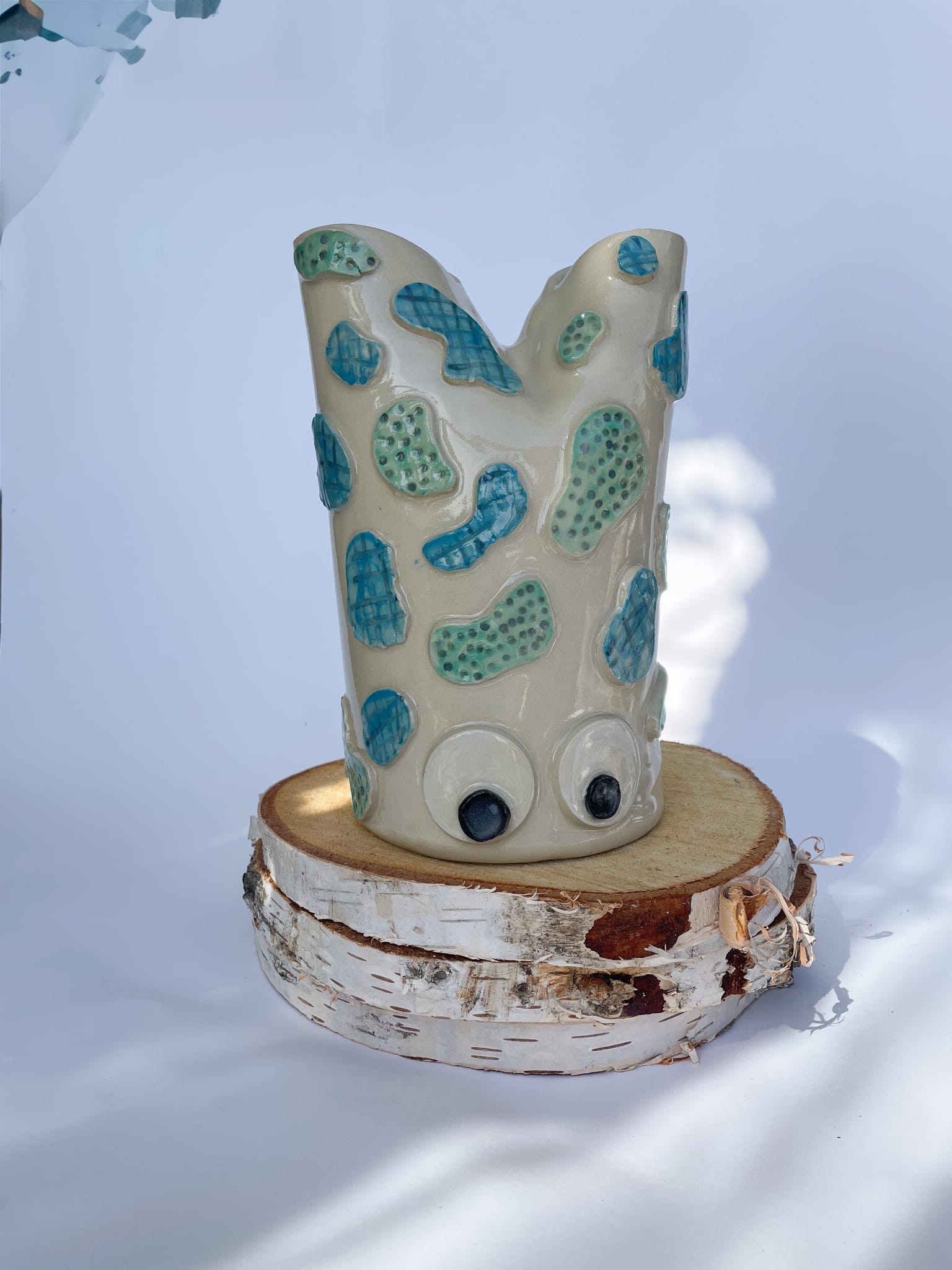 Flakon „Dziwak” udowadnia, że ceramika może być jednocześnie sztuką i żartem. Jego powierzchnię zdobią ręcznie wykonane, szkliwione łaty w turkusowych i zielonych odcieniach, które przypominają bajkową skórę stworka z innego świata. Duże oczka ożywiają całość i dodają mu humoru.