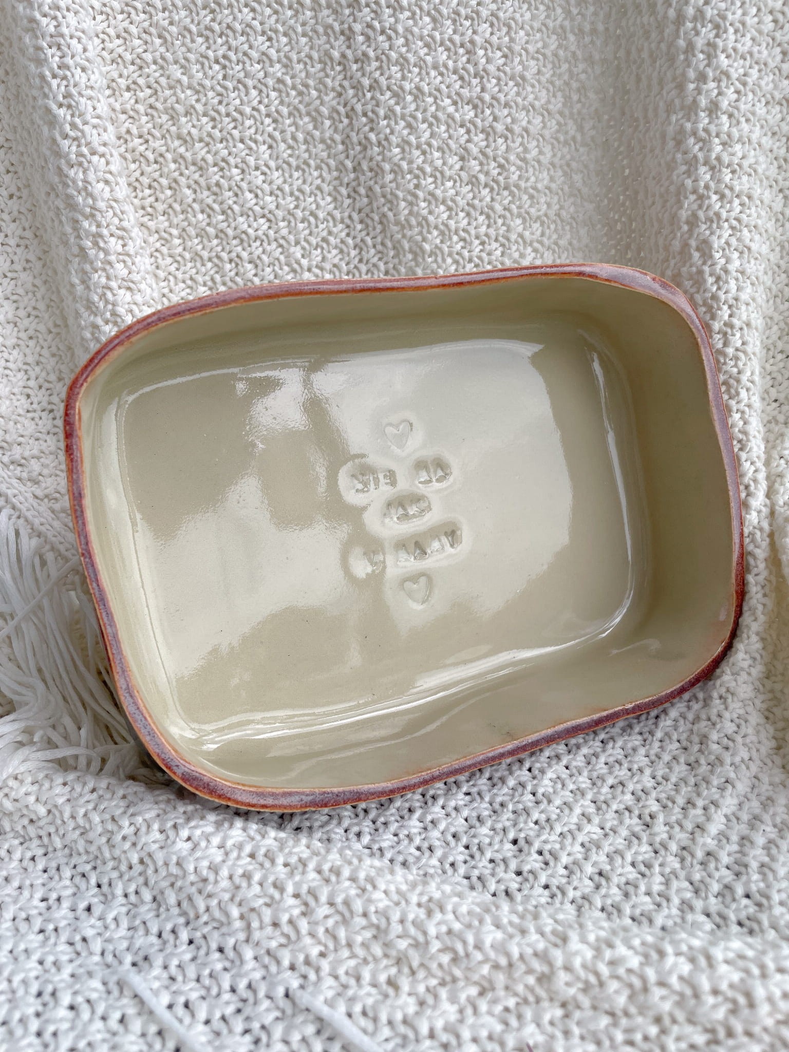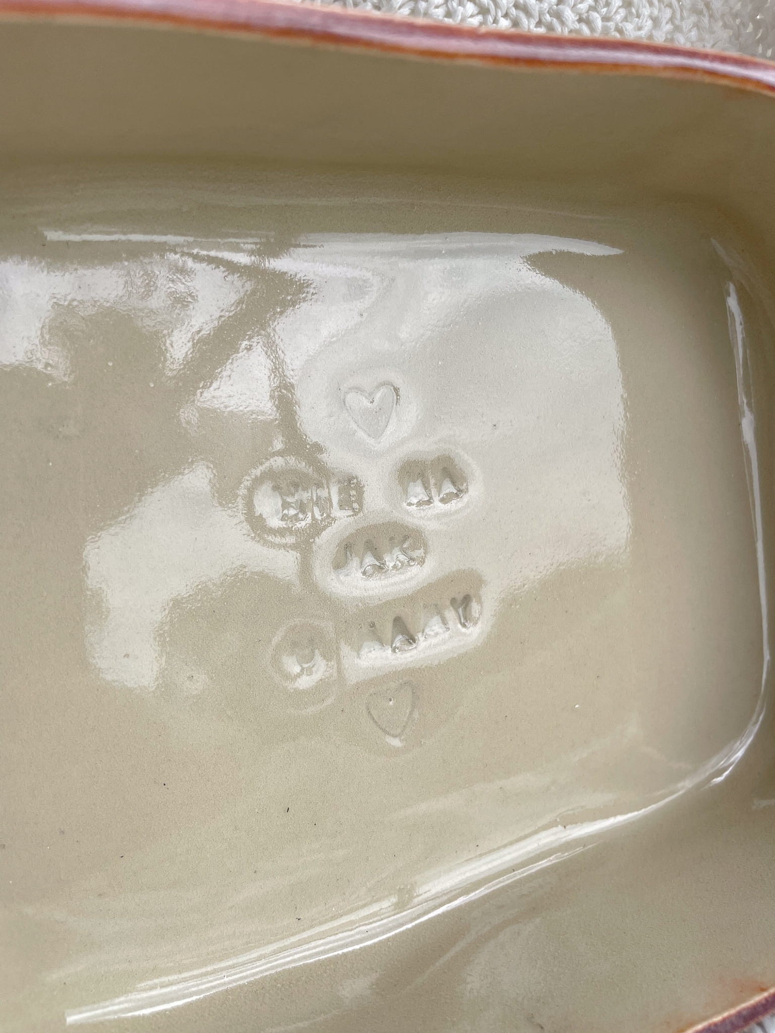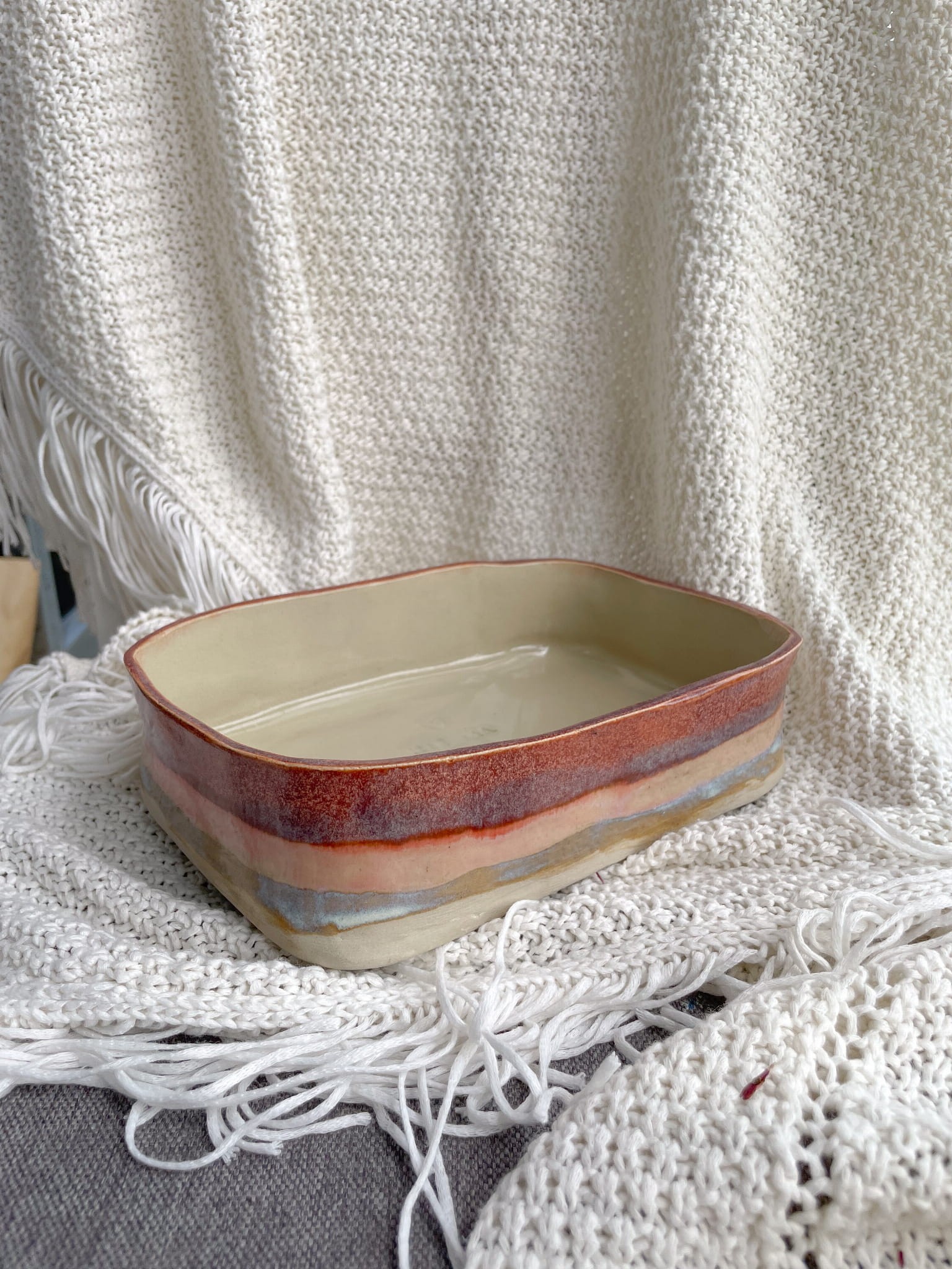 „Ziemia i Ogień” to foremka ceramiczna, która przyciąga wzrok swoim wyjątkowym szkliwieniem. Ciepłe odcienie czerwieni, brązów, błękitów i beżu układają się warstwowo niczym przekrój przez geologiczną strukturę – tworząc niepowtarzalny efekt inspirowany naturą. Każda sztuka jest ręcznie formowana i szkliwiona, co sprawia, że nie ma dwóch identycznych egzemplarzy.
