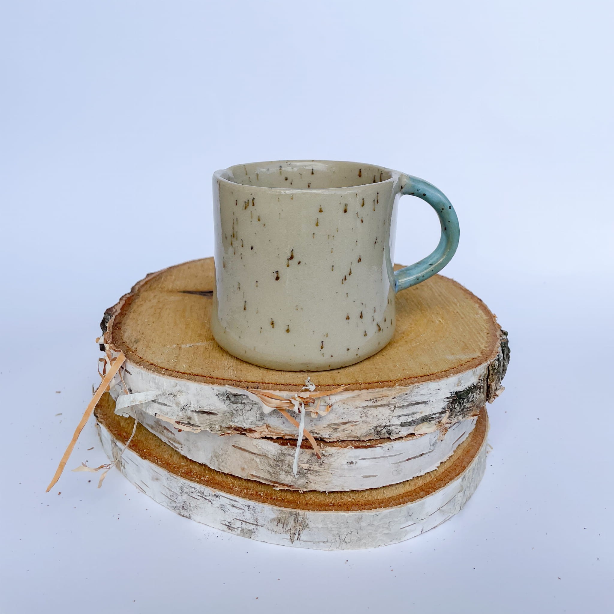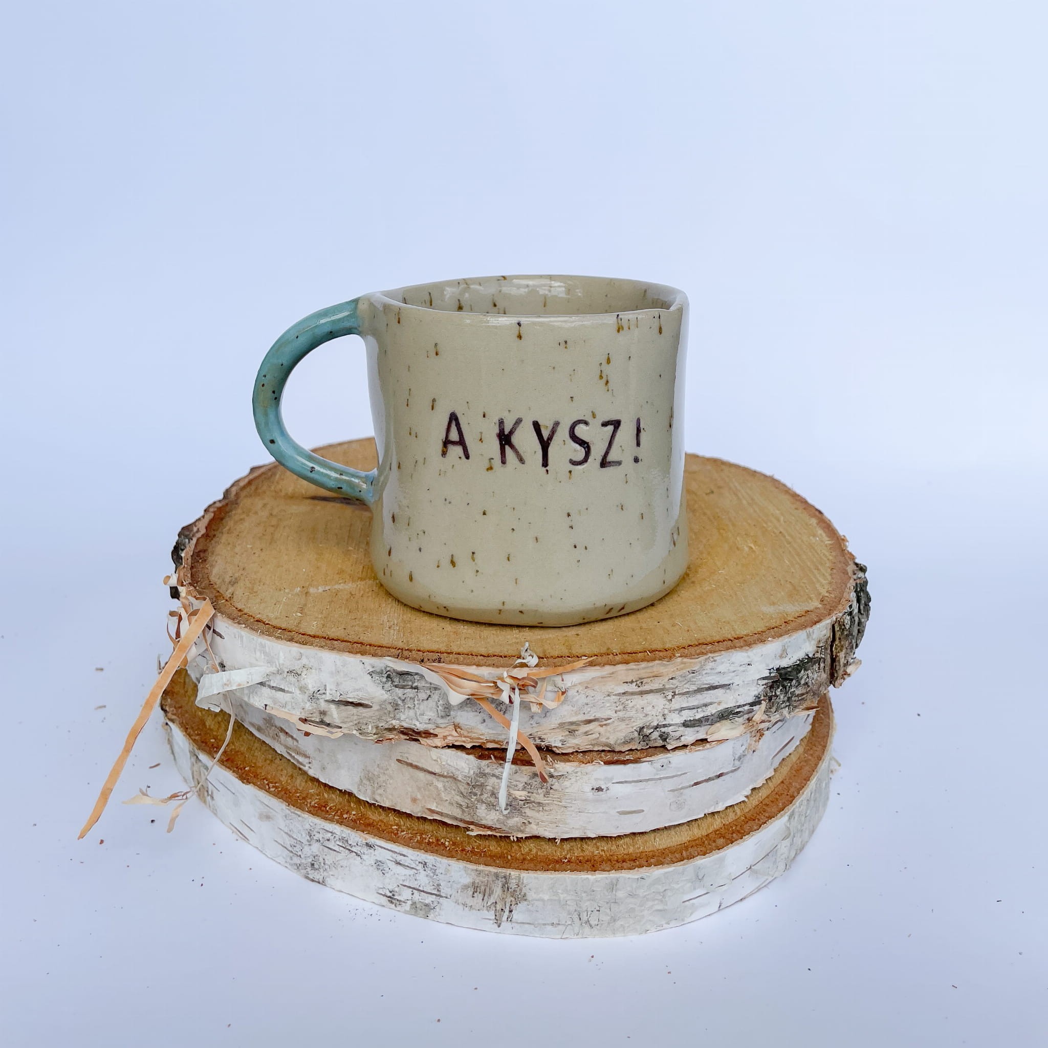 Kubek „A Kysz!” to ręcznie wykonana, unikatowa ceramika, która łączy humor i rzemiosło w najlepszym wydaniu. Beżowa, delikatnie nakrapiana glina nadaje mu naturalny, rustykalny charakter, a kontrastowe turkusowe ucho dodaje świeżości i oryginalności.