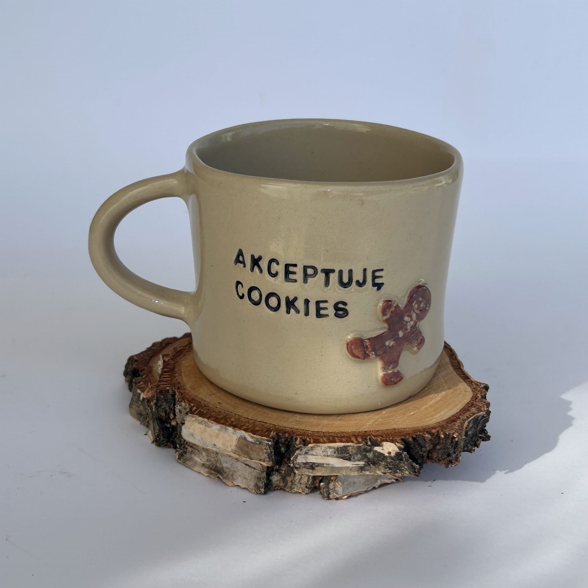 Ręcznie wykonany z kremowej gliny, z uroczym piernikowym ciasteczkiem — łączy w sobie branżowy dowcip i ciepły klimat domowych smakołyków.