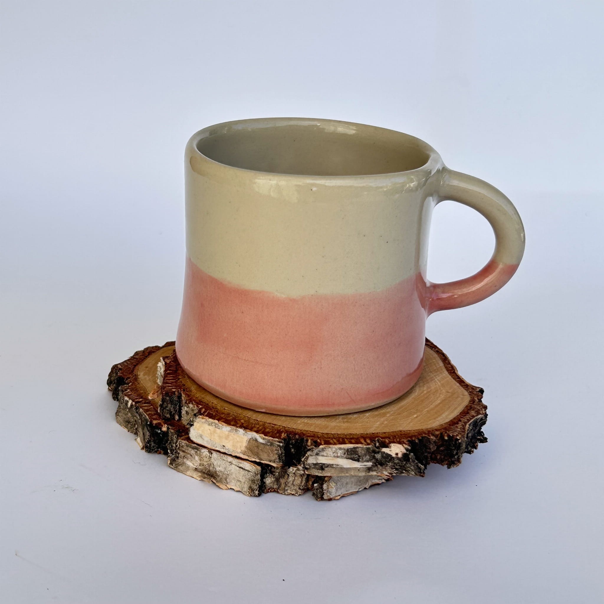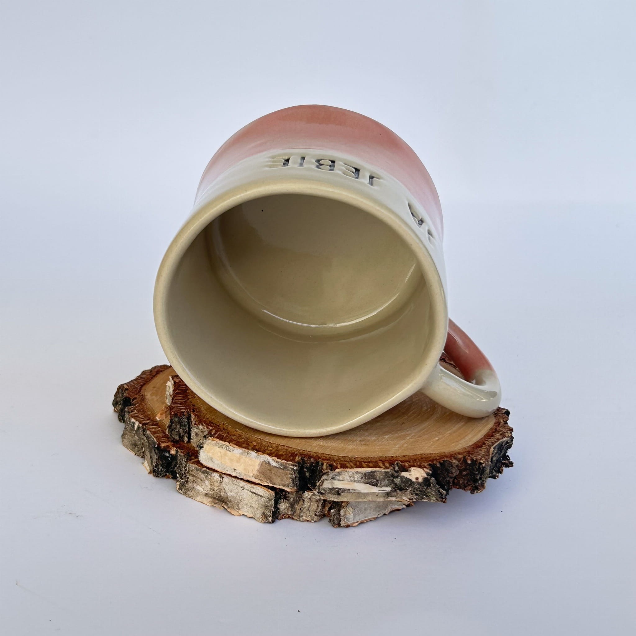 Każdy egzemplarz wykonuję ręcznie: formuję, graweruję litery i szkliwię, dlatego każdy kubek jest inny i ma swój własny charakter. Ten model jest dodatkowo delikatnie wadliwy — szkliwo na dole kubka nie pokryło idealnie powierzchni (pokazane na zdjęciu). Nie wpływa to na użytkowanie — kubek jest w pełni szczelny i bezpieczny, a wada dodaje mu unikatowości.