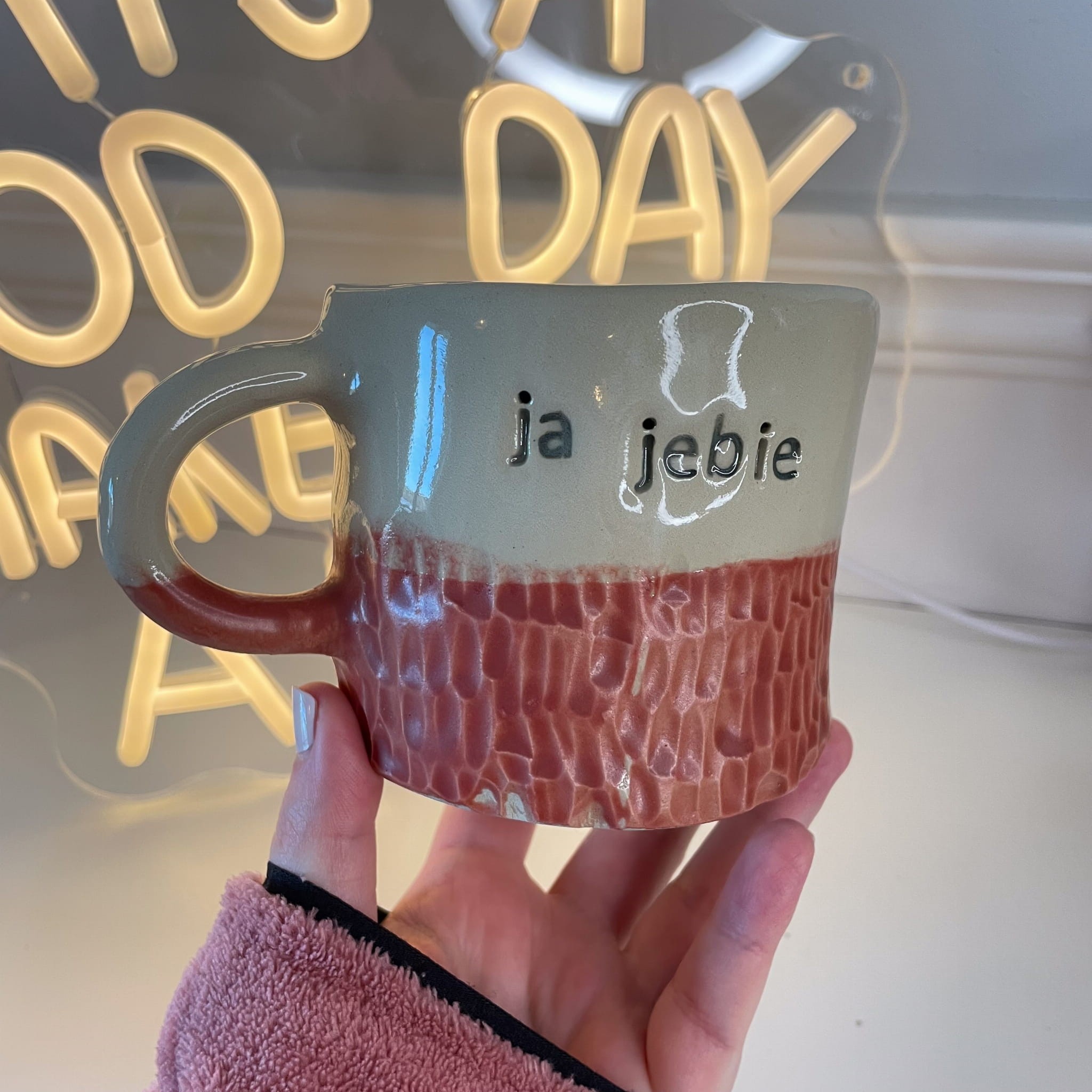 Minimalistyczny napis „ja jebie” przełamuje elegancki design bezpośrednim, ironicznym akcentem. To kubek dla osób, które lubią mocne słowa, wyrazisty styl i rękodzieło z charakterem.