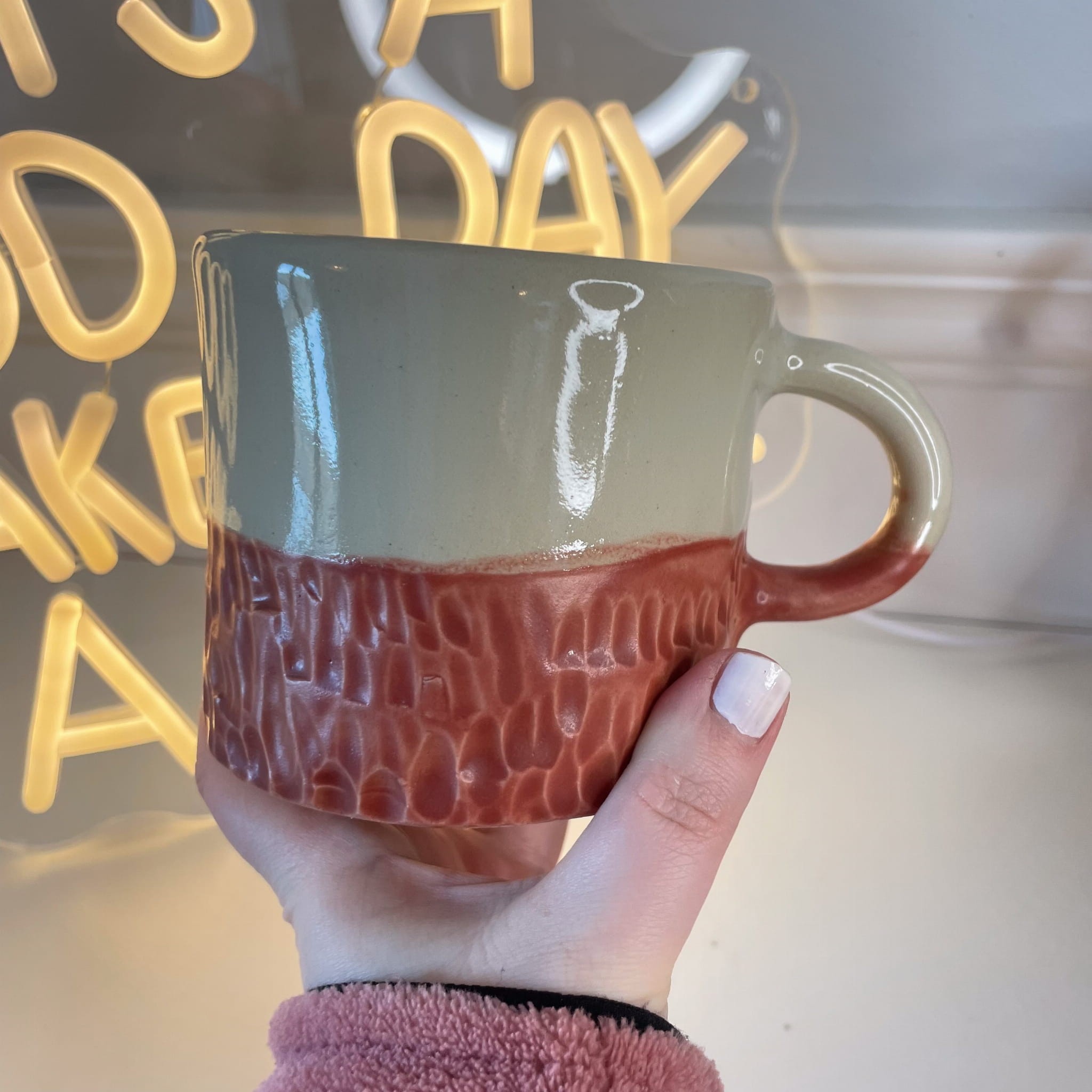 Dolna część kubka została wykończona wyraźną, nieregularną fakturą, przypominającą spękaną powierzchnię. Struktura nadaje mu wyjątkowej głębi i sprawia, że każdy egzemplarz jest niepowtarzalny w dotyku i wyglądzie.