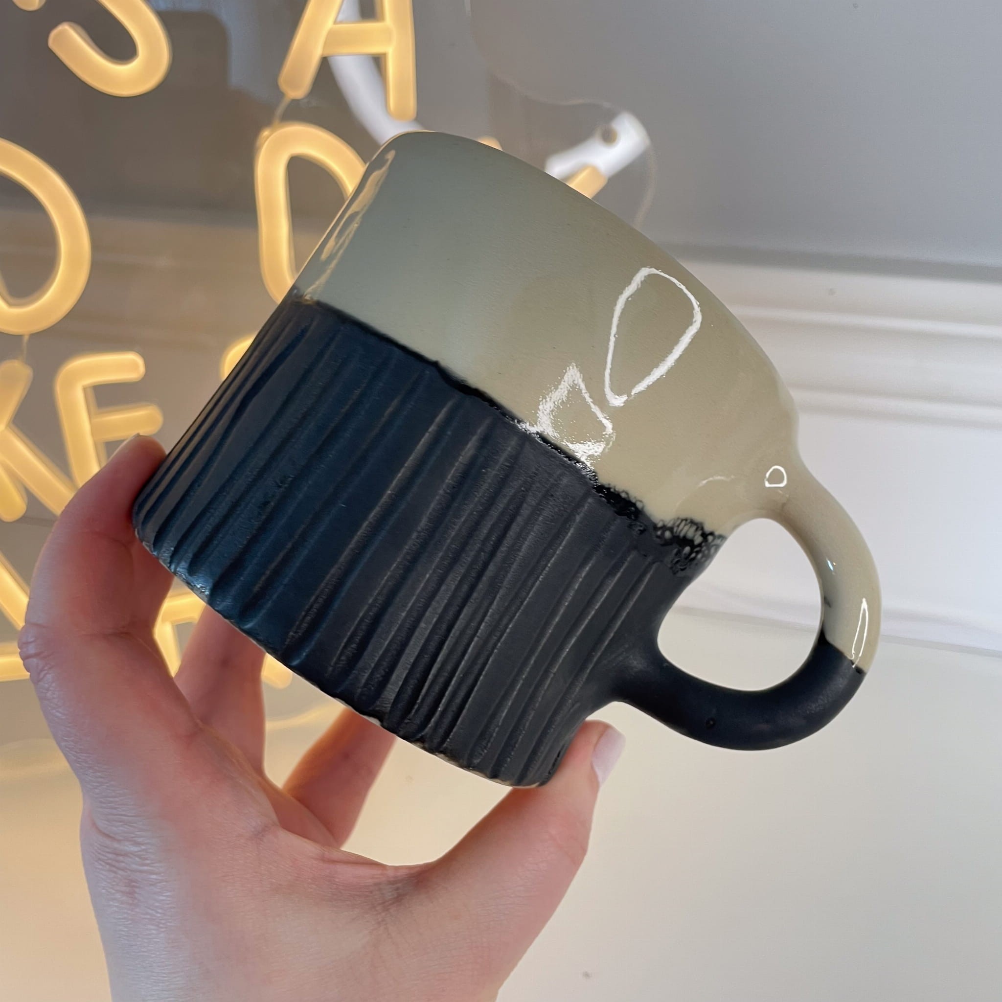 Unikatowy kubek ceramiczny wykonany ręcznie z naturalnej gliny. Górna część pokryta jest jasnym, lekko połyskującym szkliwem w odcieniu beżu, dolna – matowa, czarna i wykończona pionowym ryflowaniem, które nadaje bryle wyrazistości oraz nowoczesnego, designerskiego charakteru.