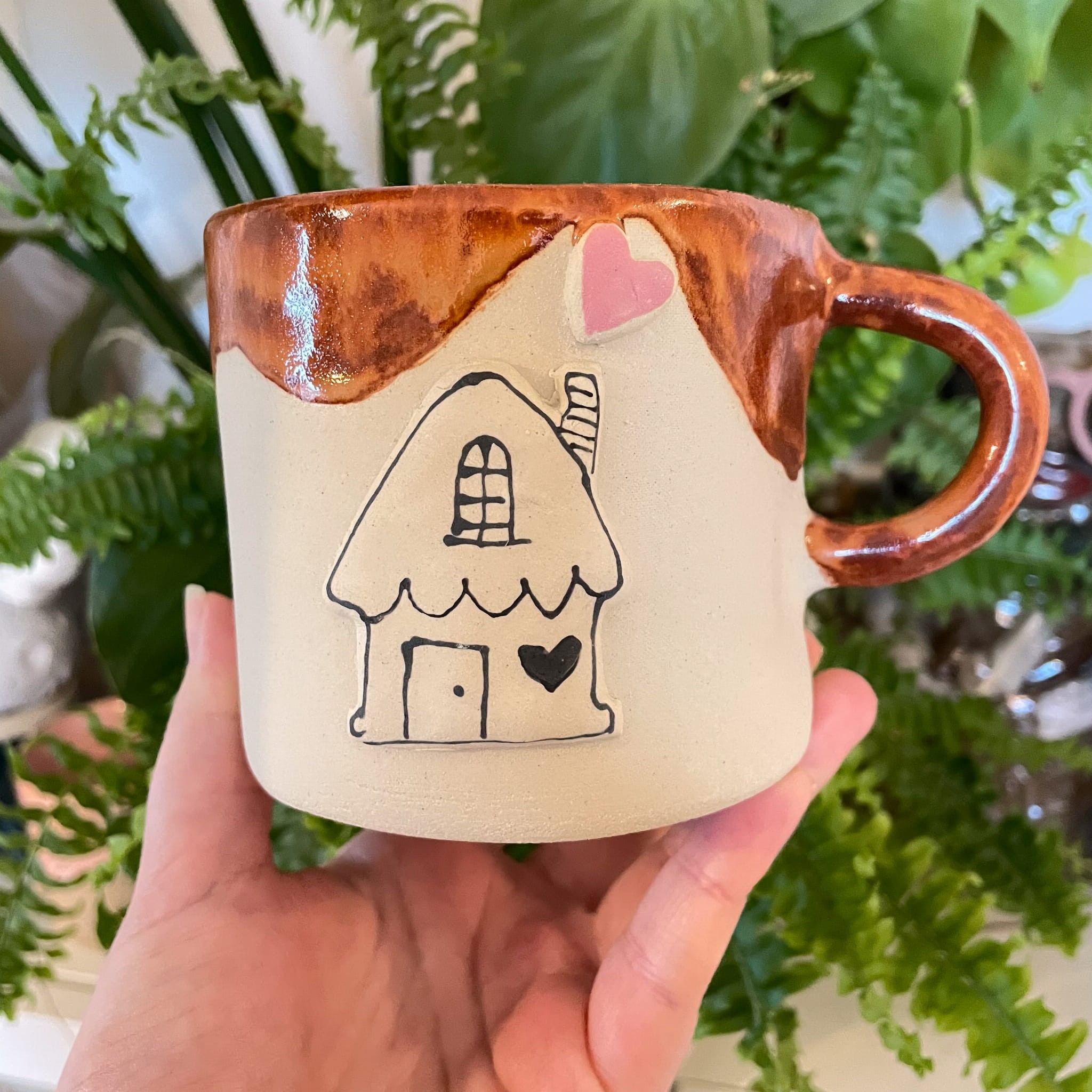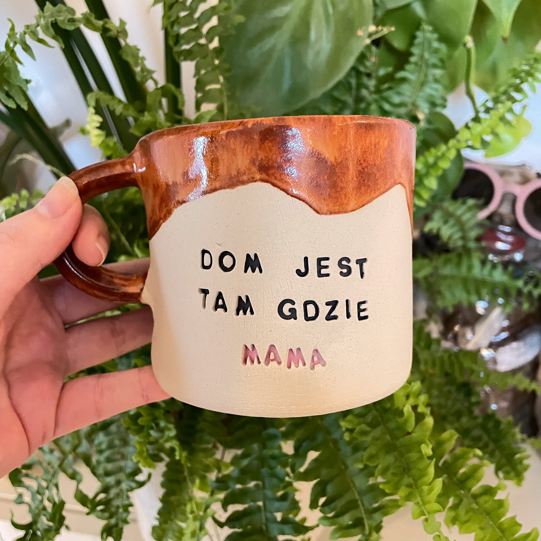 Ręcznie formowany kubek, który niesie ze sobą więcej niż tylko poranną kawę. Wypis „Dom jest tam, gdzie mama” to małe przypomnienie, że serce domu zawsze bije przy niej. Delikatne beżowe tło i karmelowa góra tworzą naturalny, domowy klimat. Każda literka jest wprasowana ręcznie, a napis MAMA wyróżnia się subtelnym, różowym akcentem. To idealny prezent dla mamy – na święta, urodziny albo po prostu tak, bez okazji. Kubek, który rozczula za każdym razem.