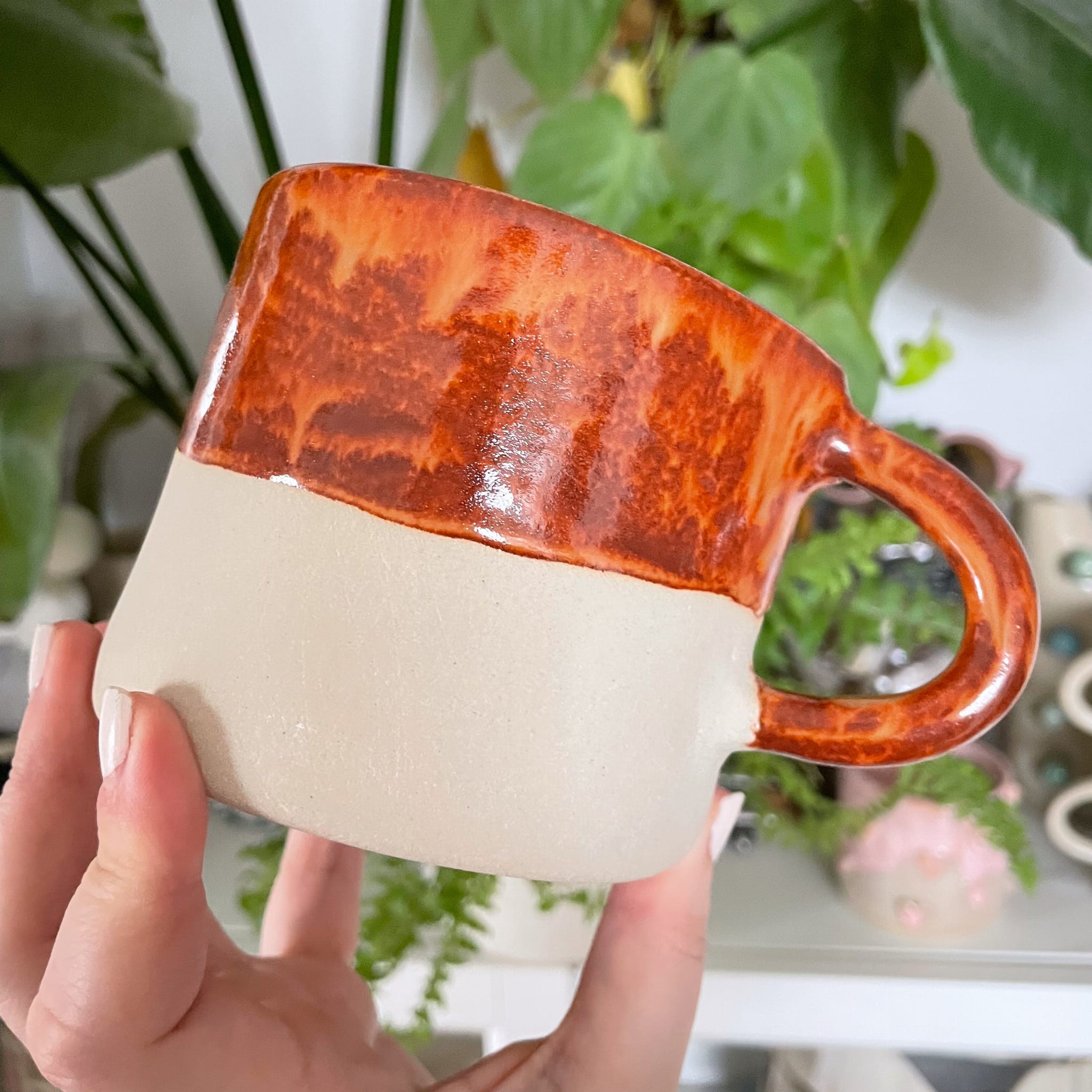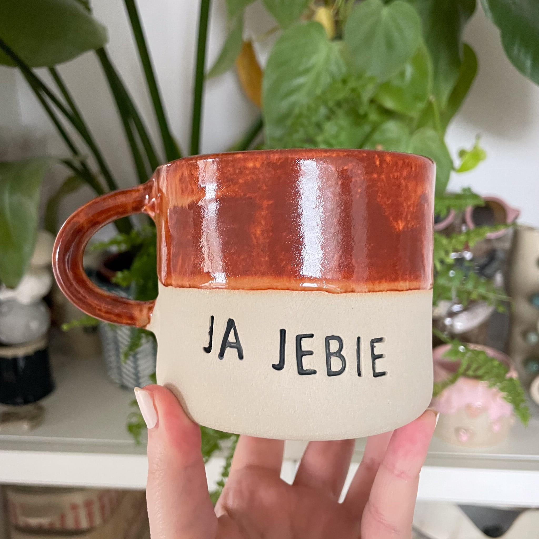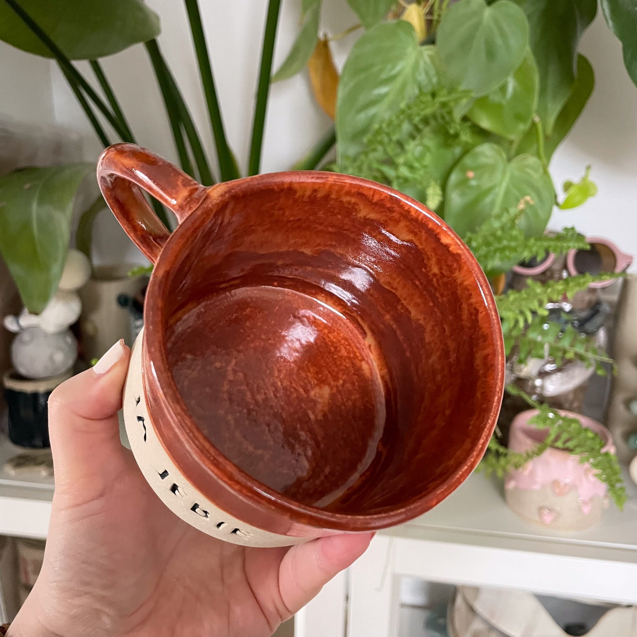 Każdy kubek jest wykonywany w całości ręcznie – od formowania bryły, przez ręczne nakładanie szkliwa w ciepłym, karmelowym odcieniu, aż po precyzyjne wyciskanie i malowanie napisu. Następnie kubek trafia do podwójnego wypału w wysokiej temperaturze, dzięki czemu zyskuje trwałość oraz odporność na codzienne użytkowanie. Napis nie ściera się i nie blaknie, a nieregularna linia szkliwa sprawia, że każdy egzemplarz jest jedyny w swoim rodzaju.
