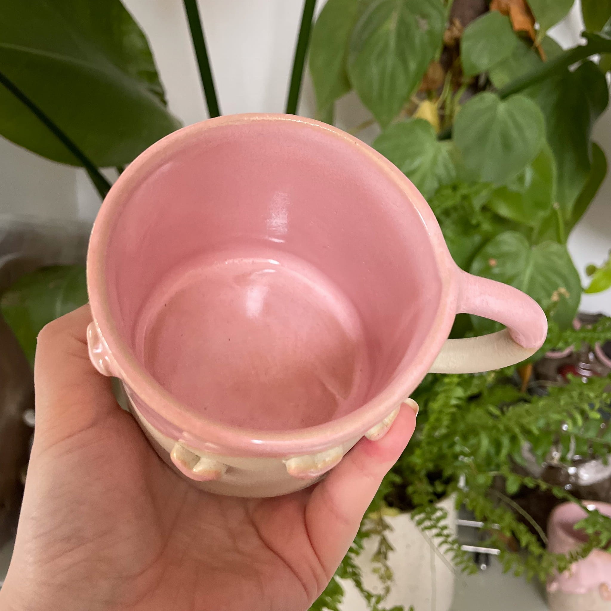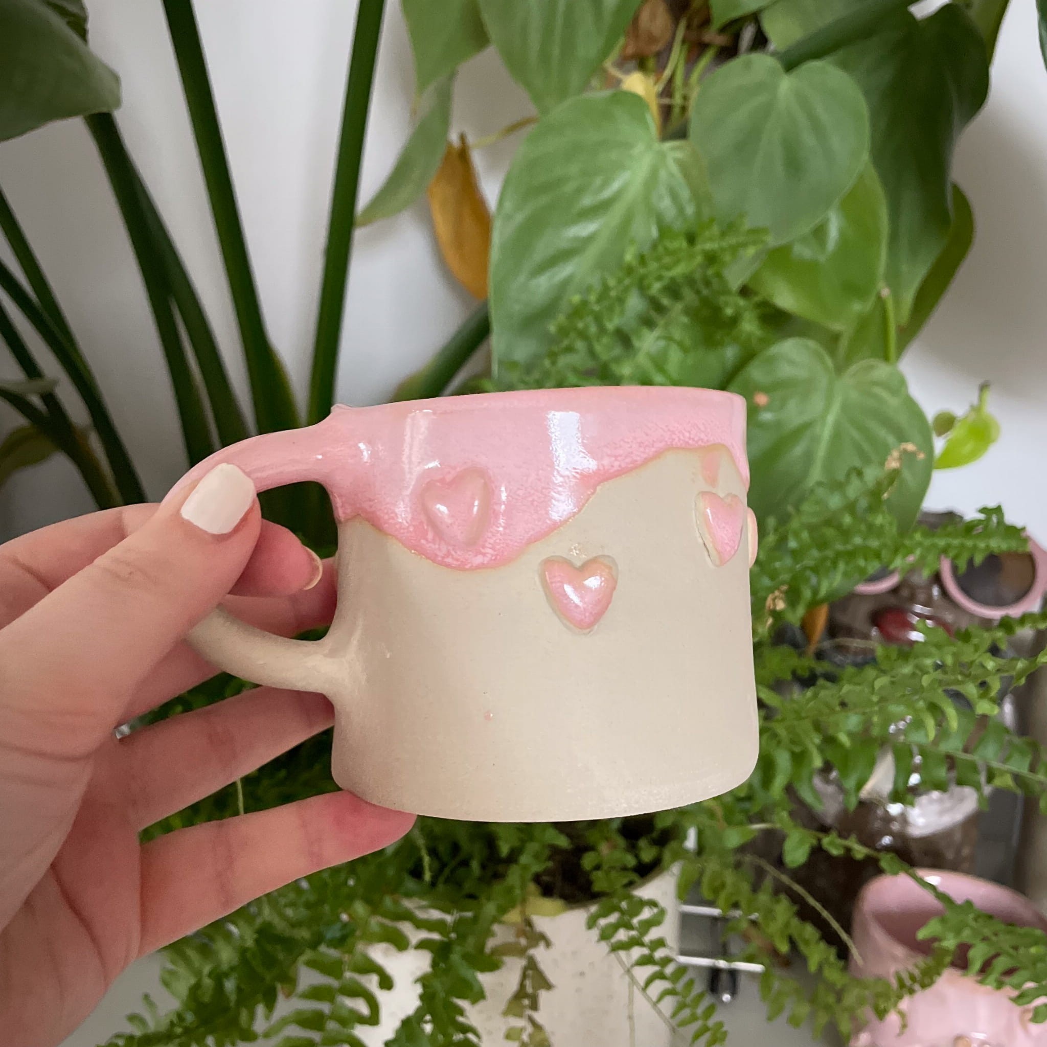 Ten kubek powstał w całości ręcznie – od formowania, przez zdobienie, aż po szkliwienie i wypał. Każdy egzemplarz jest jedyny w swoim rodzaju, dlatego nie ma dwóch identycznych sztuk. Wypukłe serduszka nadają mu wyjątkowego, delikatnie romantycznego charakteru, a miękkie przejście różowego szkliwa sprawia, że kubek wygląda jak pokryty lukrem.