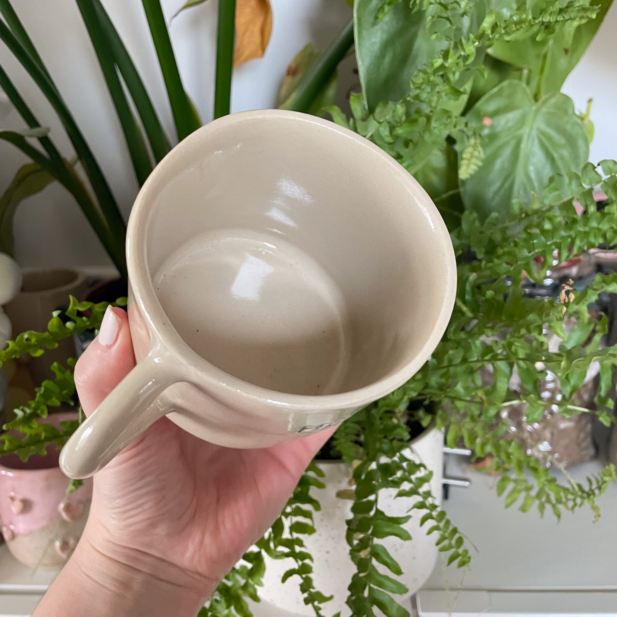 Każdy kubek tworzony jest ręcznie – od formowania, przez nanoszenie liter, po szkliwienie i wypał. Naturalna, kremowa powierzchnia oraz delikatne kontrasty podkreślają minimalistyczną estetykę GLIFY, pozwalając treści grać pierwsze skrzypce.