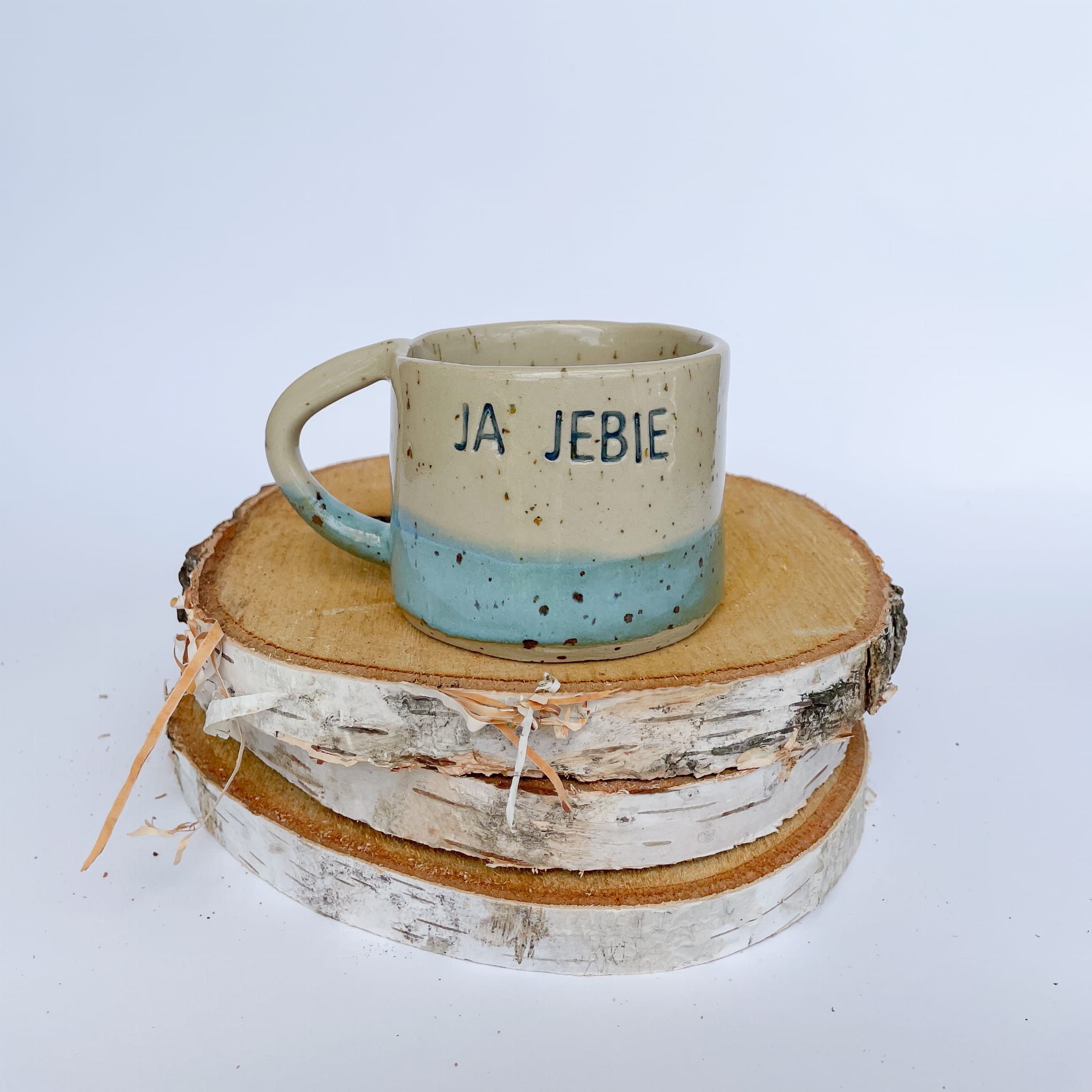 Górna część w naturalnym beżu harmonijnie łączy się z błękitnym dołem, ozdobionym charakterystycznymi kropkami i delikatnym przejściem koloru. Wyraźny napis „JA JEBIE” sprawia, że kubek staje się nie tylko naczyniem, ale i rozmownym elementem Twojej kuchni.