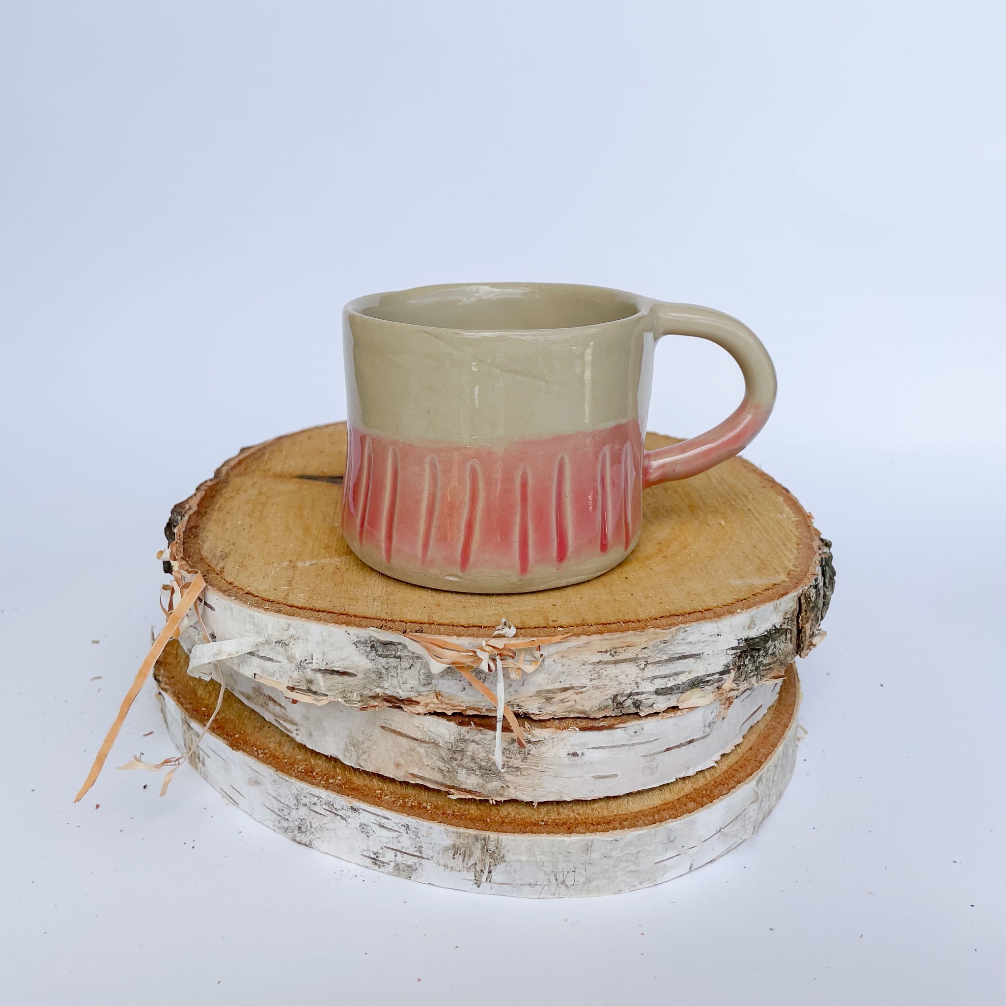 Kubek „Ja Jebię” w wersji z różowym szkliwieniem i pionową fakturą to odważne połączenie zabawnego napisu z subtelną, pastelową kolorystyką. Beżowa górna część harmonijnie łączy się z różowym dołem, na którym wyżłobiona została ręczna dekoracja, dodająca mu charakteru.