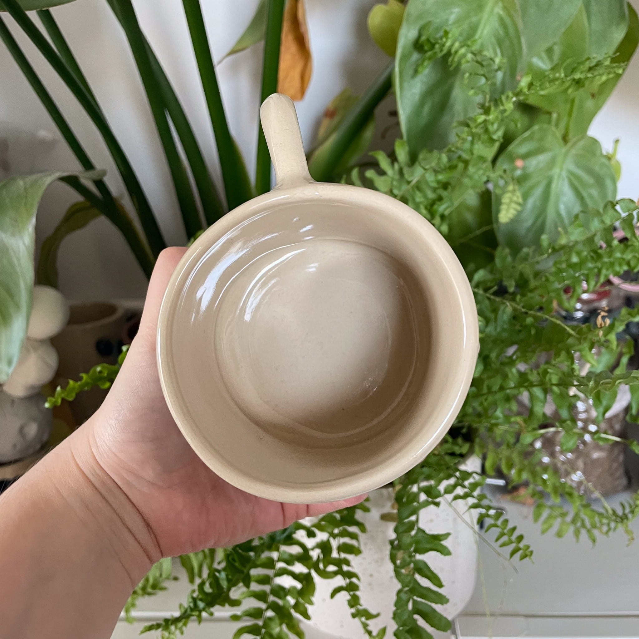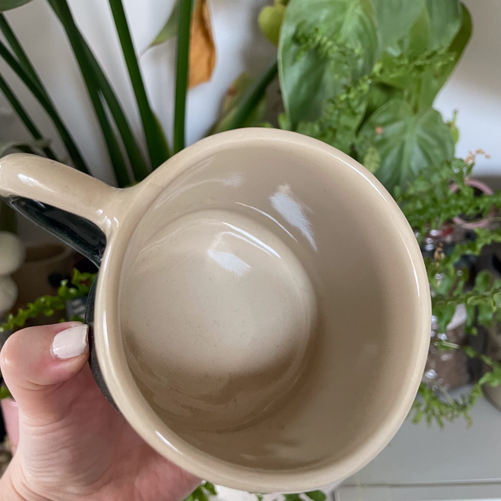 Każdy kubek tworzony jest całkowicie ręcznie: od formowania, przez nanoszenie liter, po szkliwienie i wypał w wysokiej temperaturze. Górna, kremowa część zachowuje spokojny, naturalny charakter, natomiast dolna – wykończona głęboką, zgaszoną zielenią – nadaje całości wyrazistości i unikatowego rytmu. Subtelne przejście kolorów oraz delikatna struktura powierzchni sprawiają, że nie istnieją dwa identyczne egzemplarze.