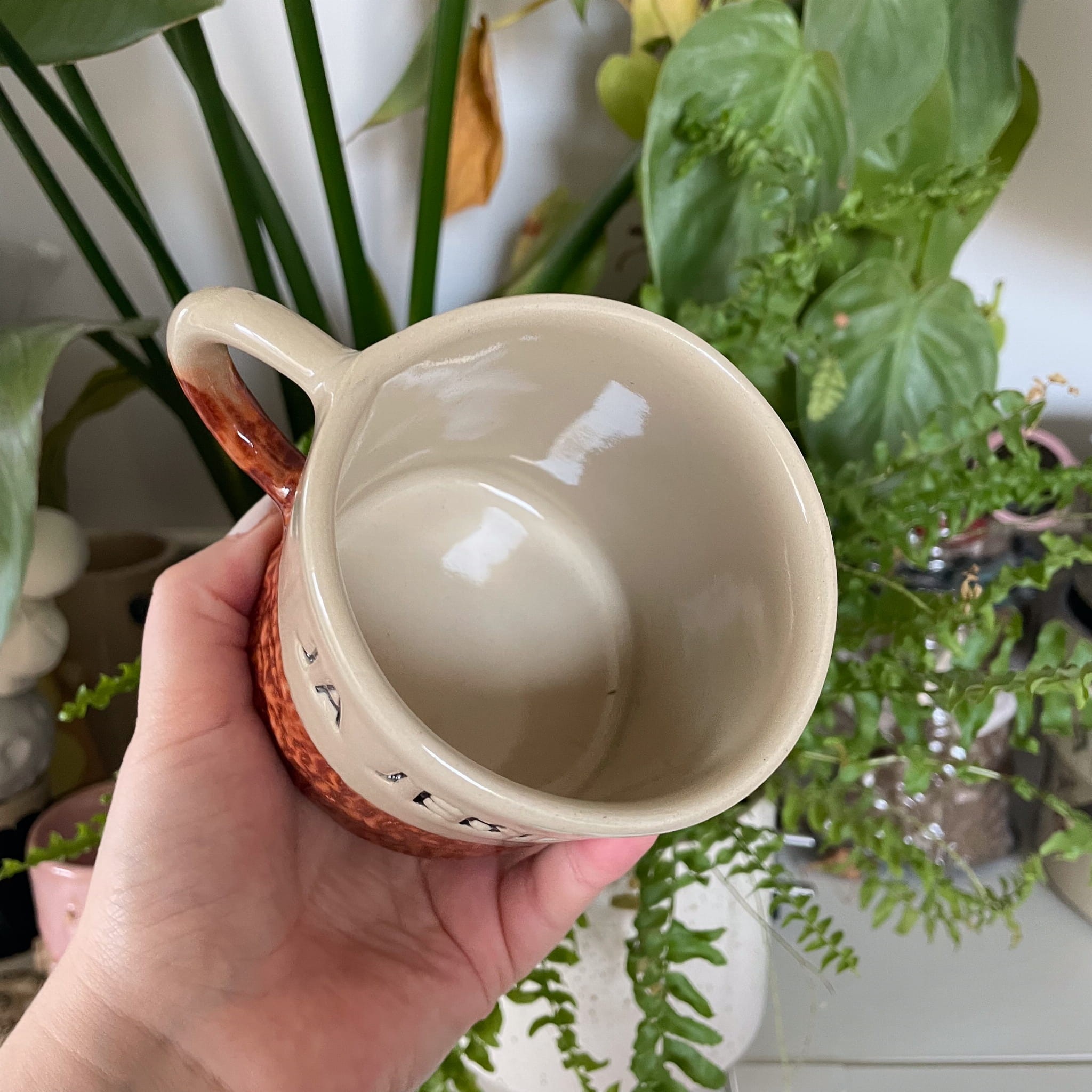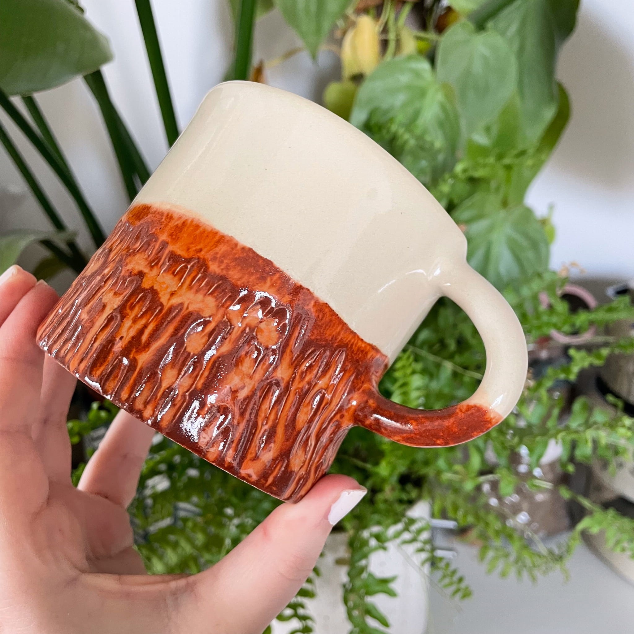 Każdy egzemplarz tworzony jest w całości ręcznie – od formowania, przez stemplowanie liter, po szkliwienie i wielogodzinny wypał. Górna część kubka pozostaje jasna, kremowa i gładka, podczas gdy dolna została wykończona strukturalną glazurą w ciepłym, gliniasto-ceglastym odcieniu. Wyraźne przejście kolorów oraz nieregularna faktura sprawiają, że każdy kubek jest jedyny w swoim rodzaju – nie istnieją dwa identyczne egzemplarze.