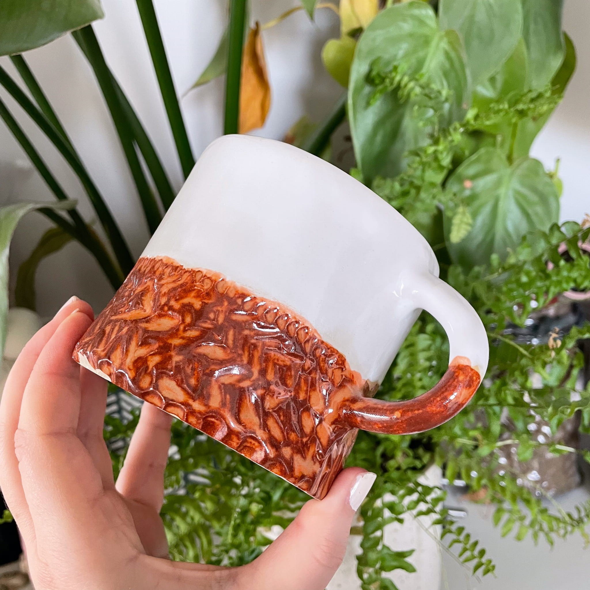 Każdy kubek GLIFY tworzony jest ręcznie: od formowania, przez nanoszenie liter, po szkliwienie. Górna, jasna część pozostaje spokojna i minimalistyczna, natomiast dolna – wykończona strukturalną glazurą w ciepłym, ceglastym odcieniu – podkreśla niepowtarzalność formy oraz naturalność materiału.