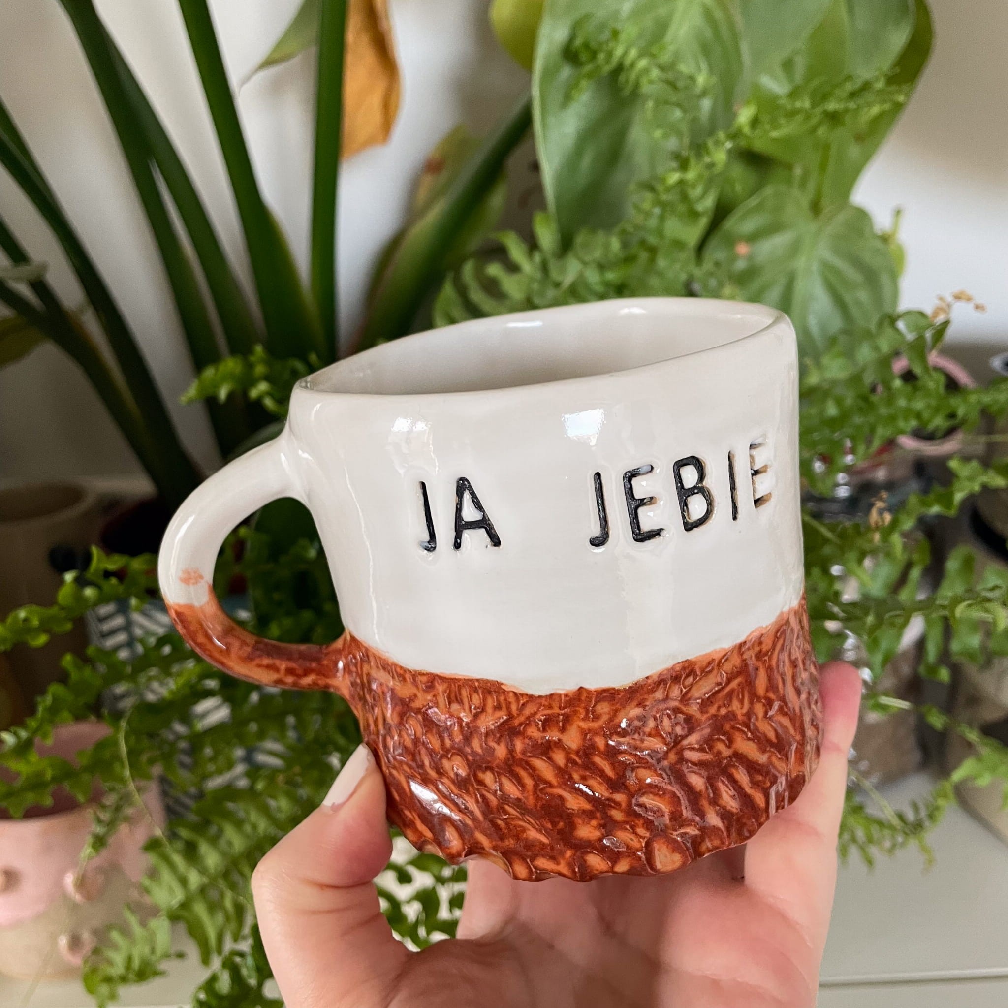 Kubek „Ja Jebię” to ceramiczny komentarz do tych poranków, kiedy słów jest już po prostu za dużo, a szczerość wygrywa z grzecznością. Prosty komunikat spotyka się tu z ręcznym charakterem ceramiki i surowym wykończeniem dolnej części naczynia.