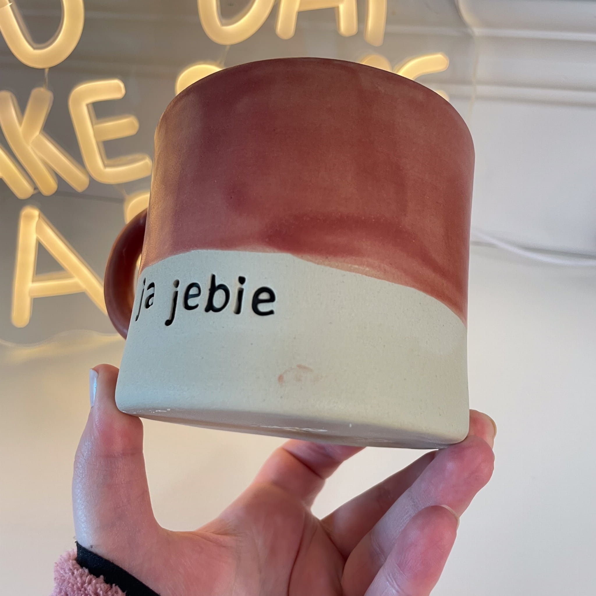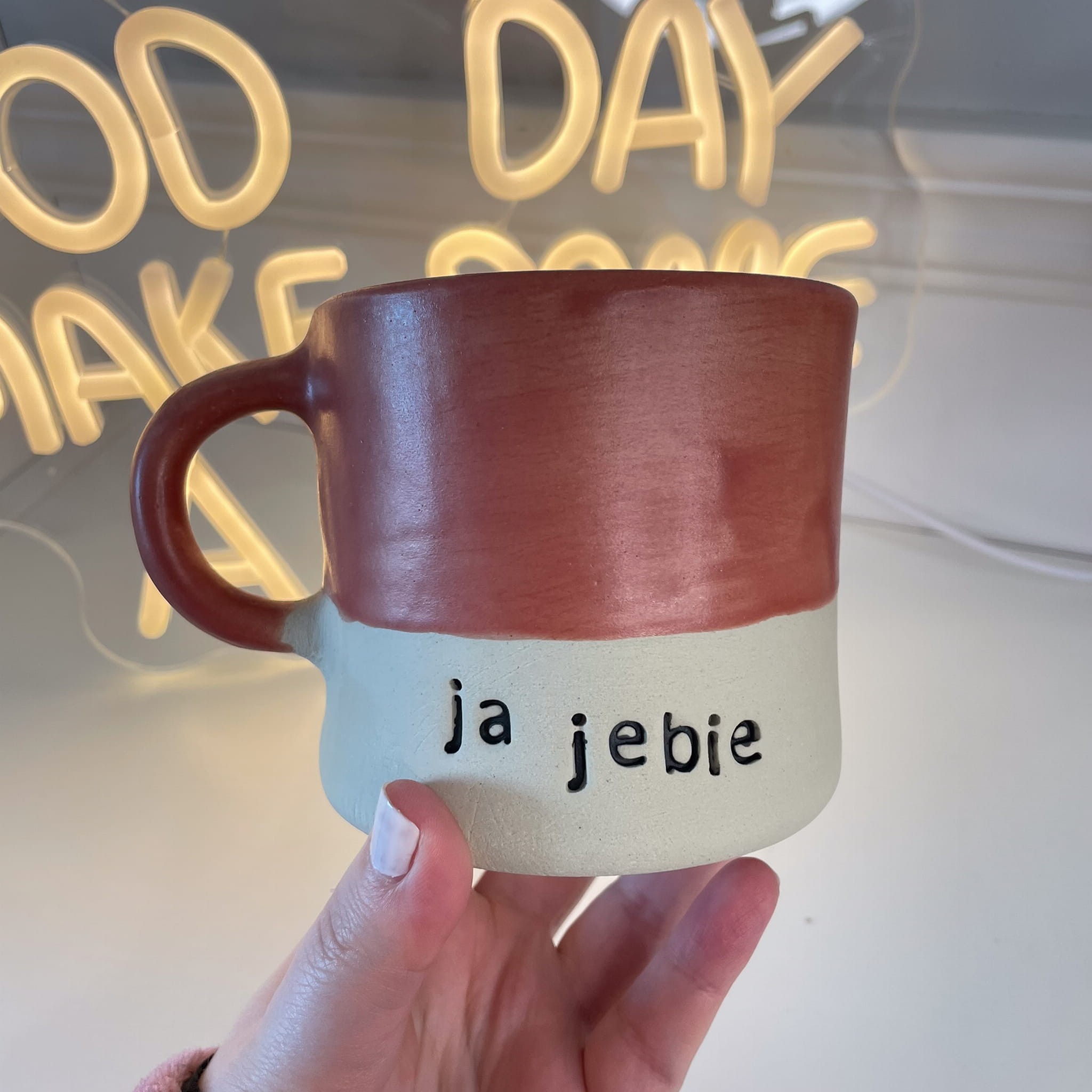 Unikatowy kubek ceramiczny wykonany ręcznie z naturalnej gliny, szkliwiony w ciepłym odcieniu różu z jasnym, beżowym dołem. Minimalistyczna forma i kontrast kolorów nadają mu nowoczesny, surowy charakter, a napis „ja jebie” dodaje bezpośredniego, ironicznego akcentu.