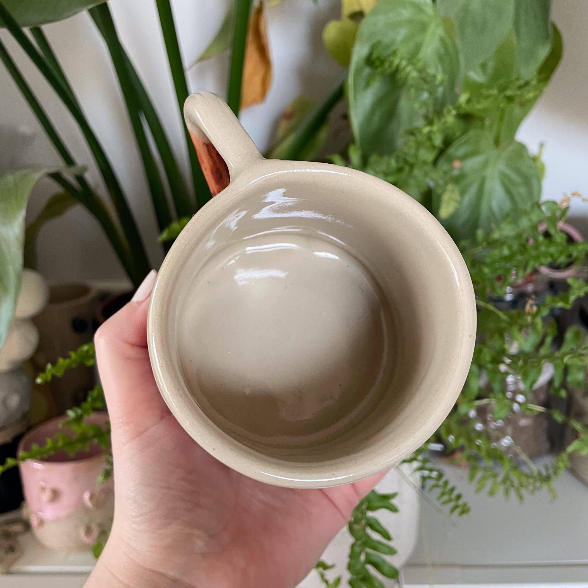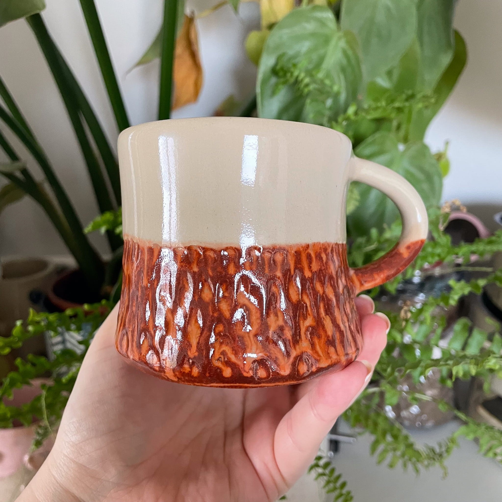Każdy egzemplarz tworzony jest w całości ręcznie – od formowania, przez stemplowanie liter, po szkliwienie i wielogodzinny wypał. Górna część kubka pozostaje jasna, kremowa i gładka, podczas gdy dolna została wykończona strukturalną glazurą w ciepłym, gliniasto-ceglastym odcieniu. Wyraźne przejście kolorów oraz nieregularna faktura sprawiają, że każdy kubek jest jedyny w swoim rodzaju – nie istnieją dwa identyczne egzemplarze.