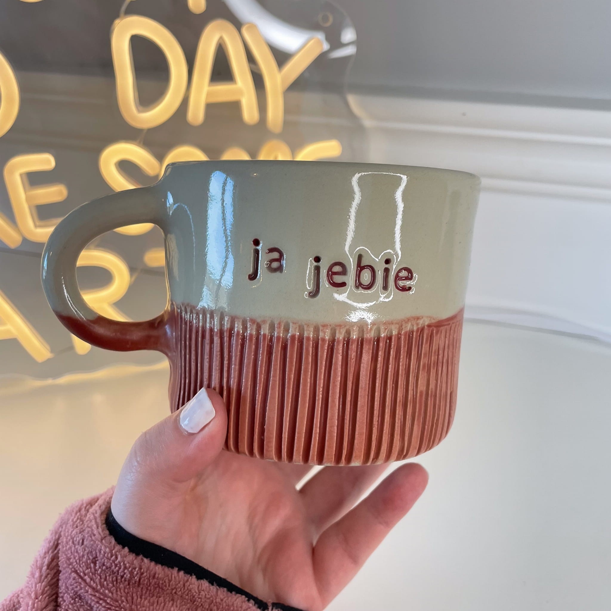 Ręcznie robiony kubek ceramiczny z napisem „ja jebie” to połączenie ceramiki artystycznej i wyrazistego humoru. Jasne szkliwo w połączeniu z ceglastym, ryflowanym dołem tworzy nowoczesną, designerską formę inspirowaną estetyką slow life i minimalizmem.