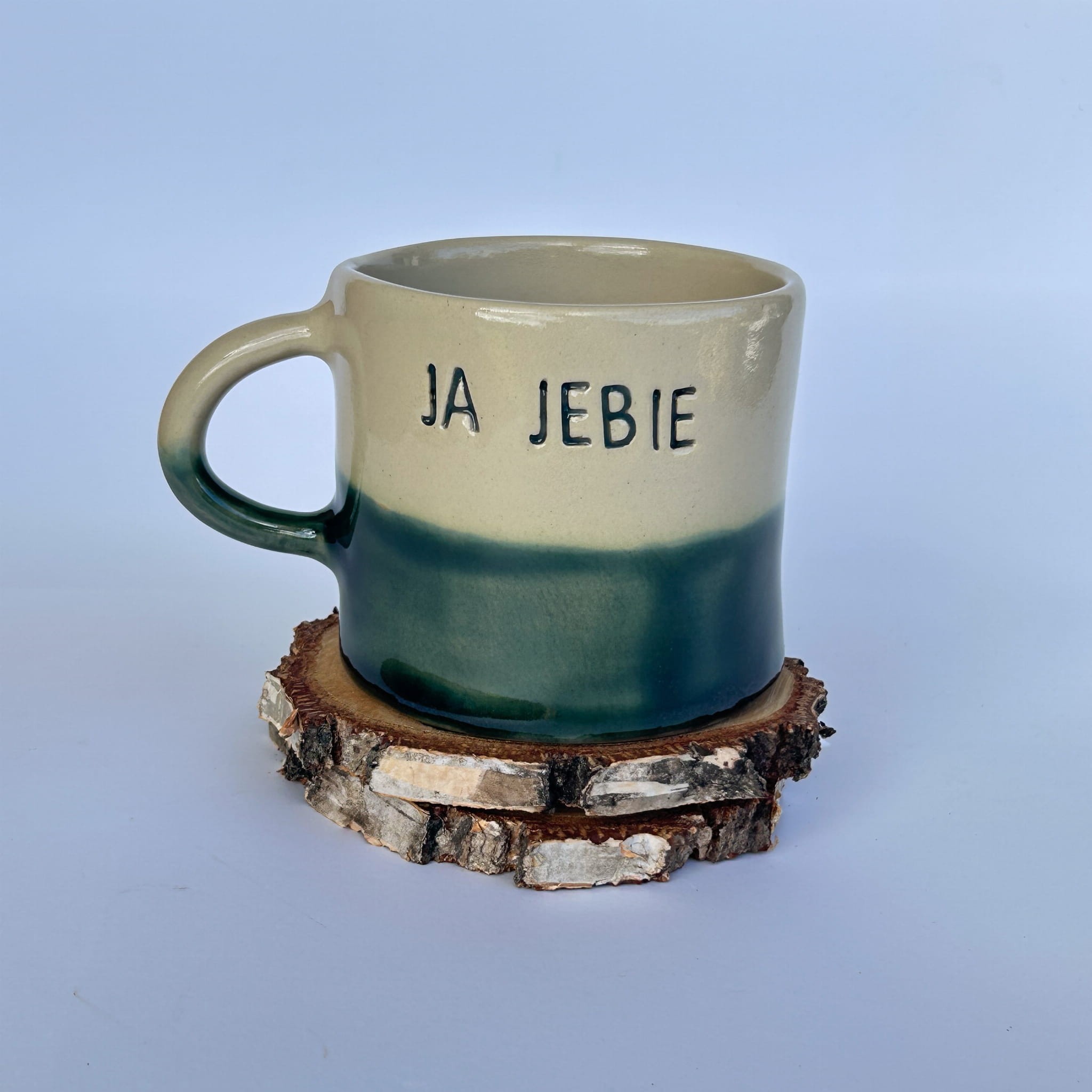 Kubek „JA JEBIE” w zielonym szkliwieniu to połączenie minimalizmu, ręcznej pracy i nieco dosadnego poczucia humoru. Każda sztuka ma unikalny układ szkliwa, dzięki czemu nie ma dwóch identycznych egzemplarzy.