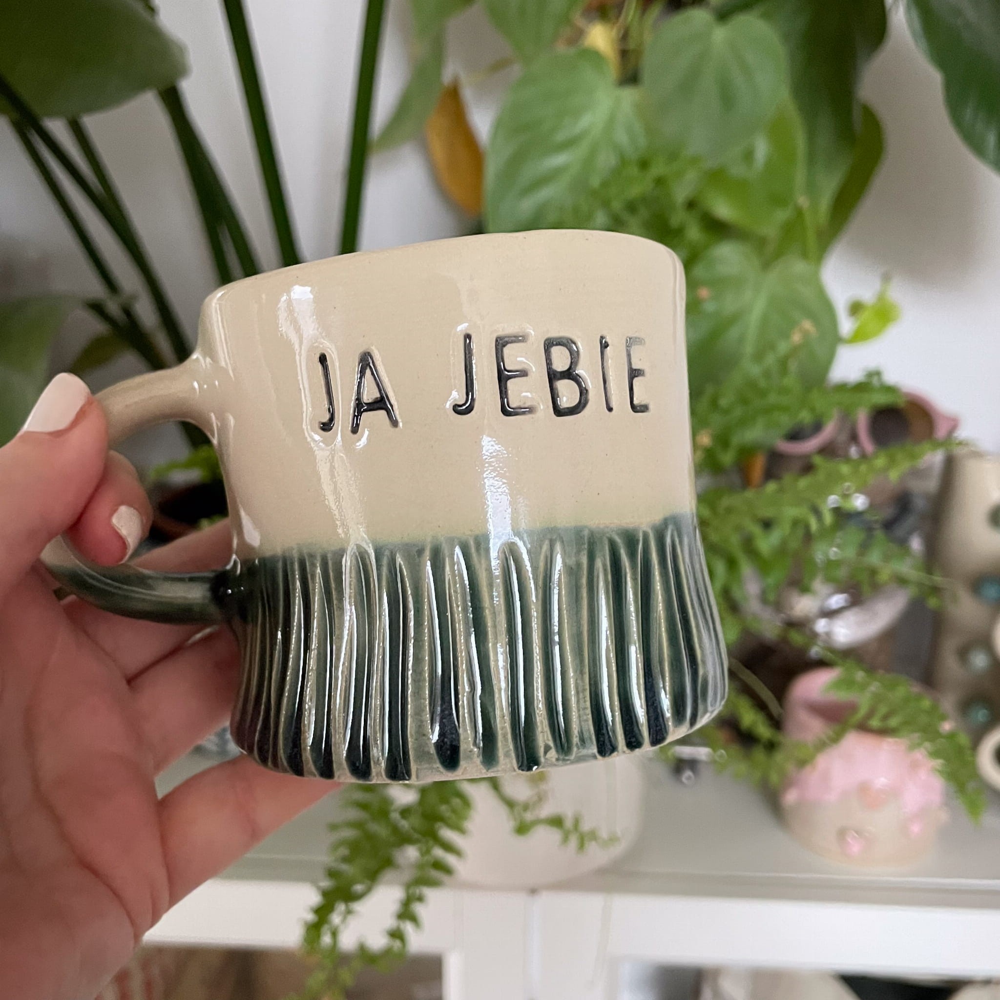 Ten kubek to połączenie surowej formy z bezpośrednim przekazem. Powstał metodą ręcznego formowania, a następnie został pokryty szkliwem w dwóch tonach – naturalnej, kremowej bazie oraz głębokiej zieleni podkreślającej dolną, mocno fakturowaną część naczynia. Wypukły napis „JA JEBIE” został wykonany ręcznie, co sprawia, że każda litera ma nieco nieregularny charakter.