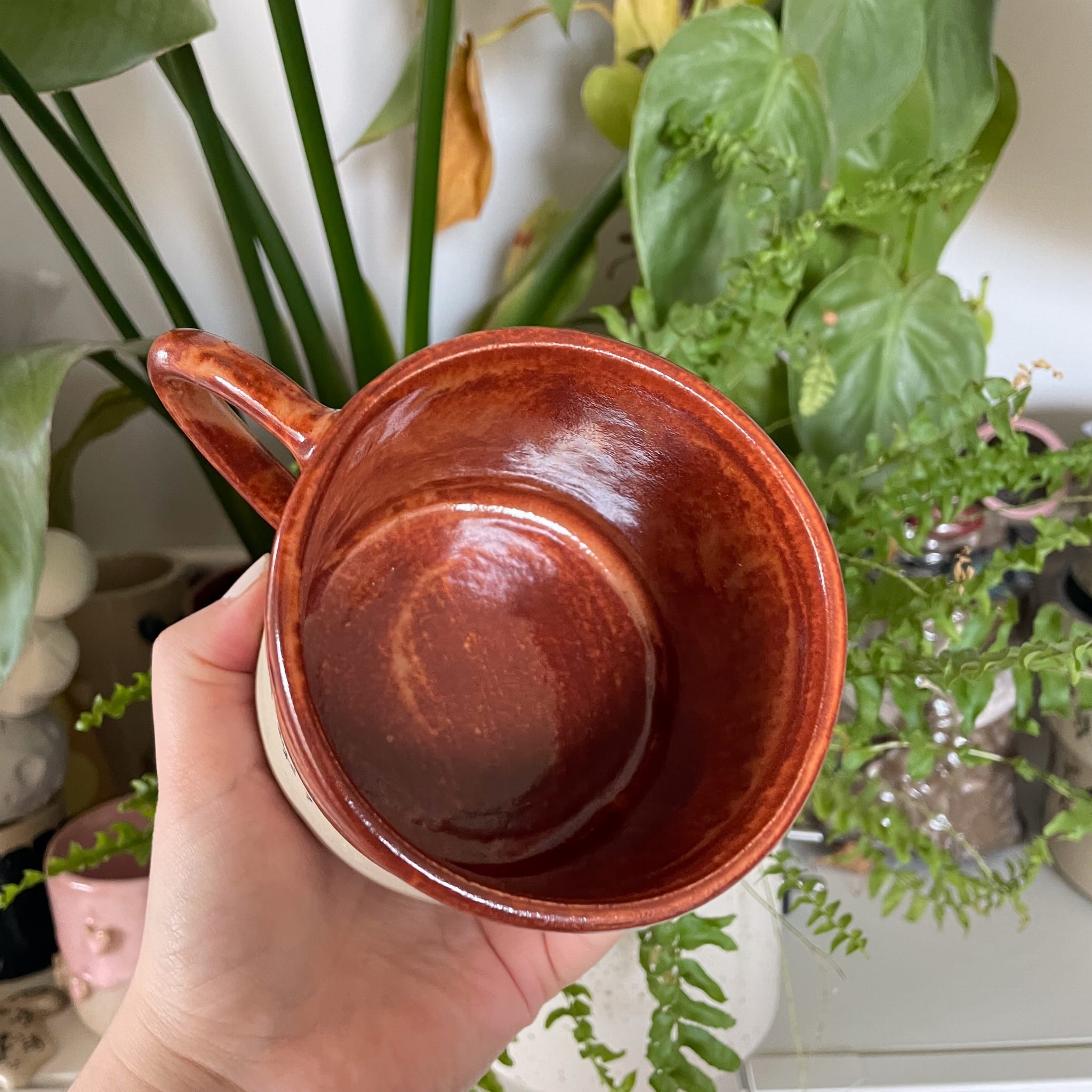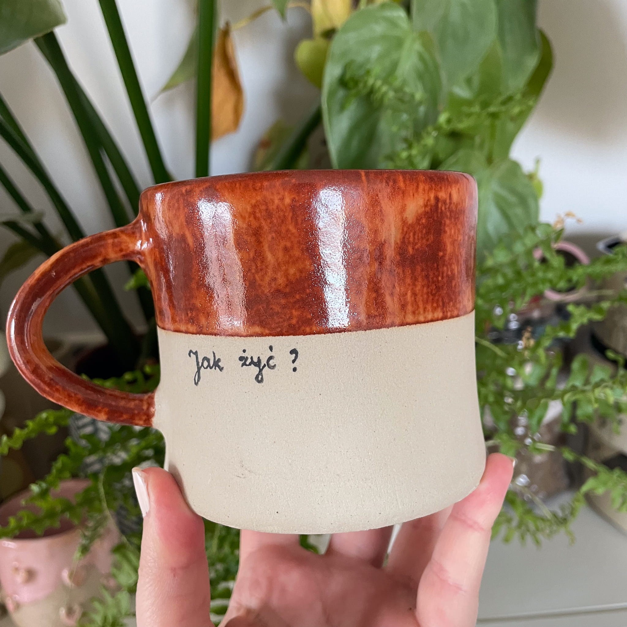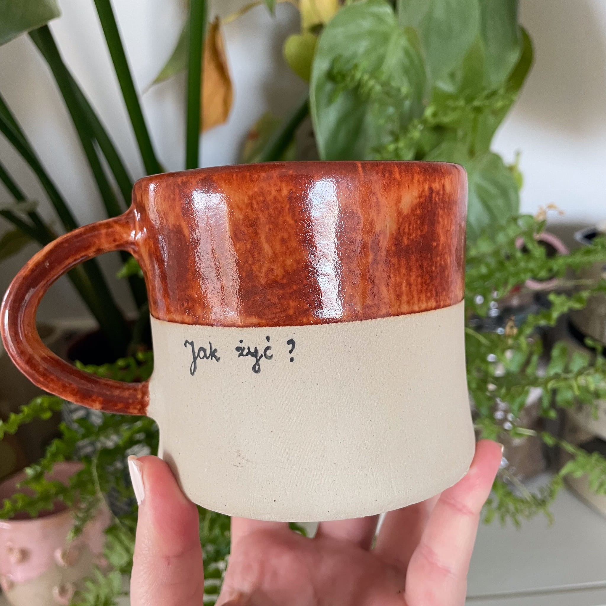 Każdy egzemplarz powstaje ręcznie – od uformowania naczynia, przez nanoszenie napisu, aż po szkliwienie i wypał w wysokiej temperaturze. Połączenie kremowej, matowej podstawy z ciepłym, rdzawo-karmelowym szkliwem górnej części tworzy naturalny kontrast, który podkreśla rzemieślniczy charakter kubka. Delikatne różnice w fakturze i przejściach kolorów sprawiają, że każdy kubek jest absolutnie niepowtarzalny.
