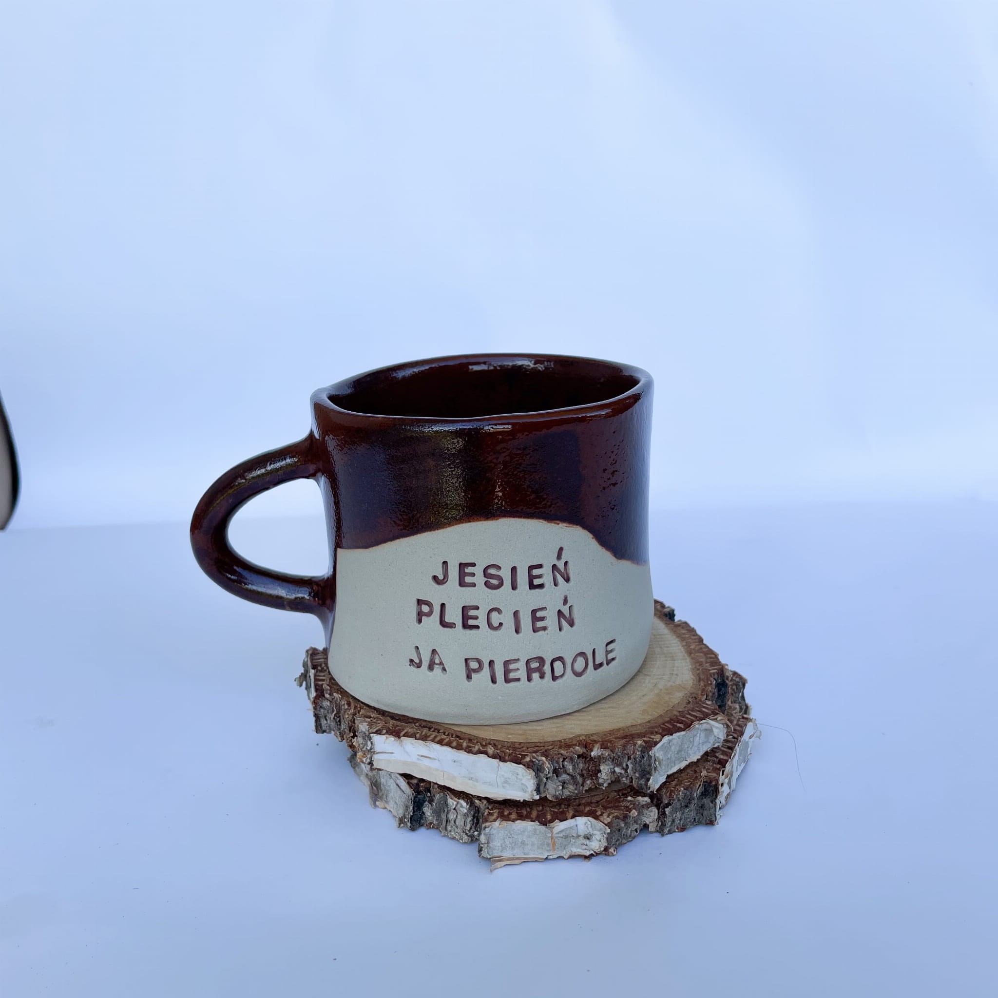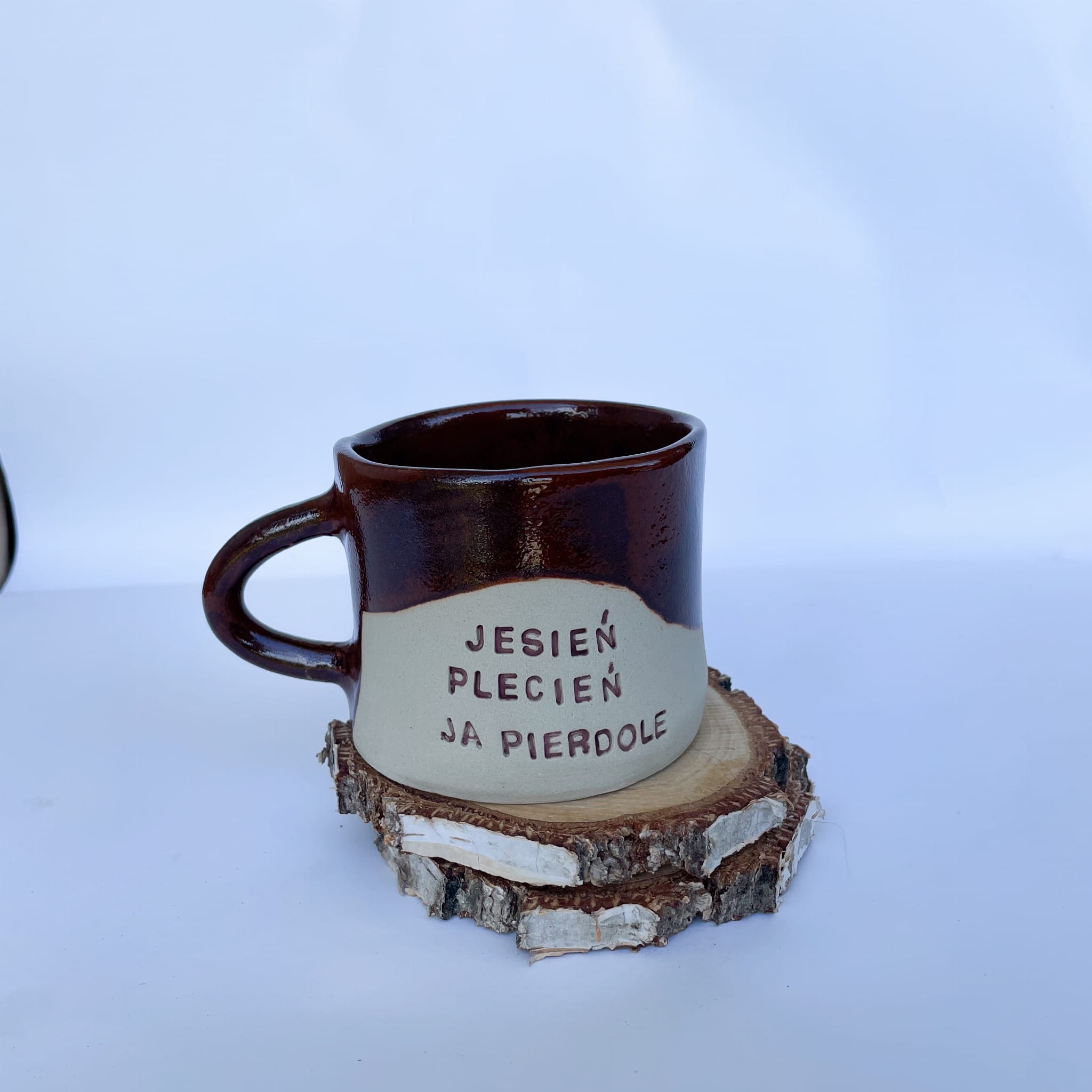 Ręcznie wykonany kubek ceramiczny z mocnym jesiennym akcentem. Napis „Jesień plecień, ja pierdolę” to szczera odpowiedź na pluchę, zimny wiatr i spadające liście. Kubek o klasycznej formie, w brązowym szkliwie z naturalnym przejściem kolorów. Świetny prezent dla osób z poczuciem humoru, które zamiast jesiennej nostalgii wybierają kawę i sarkazm.