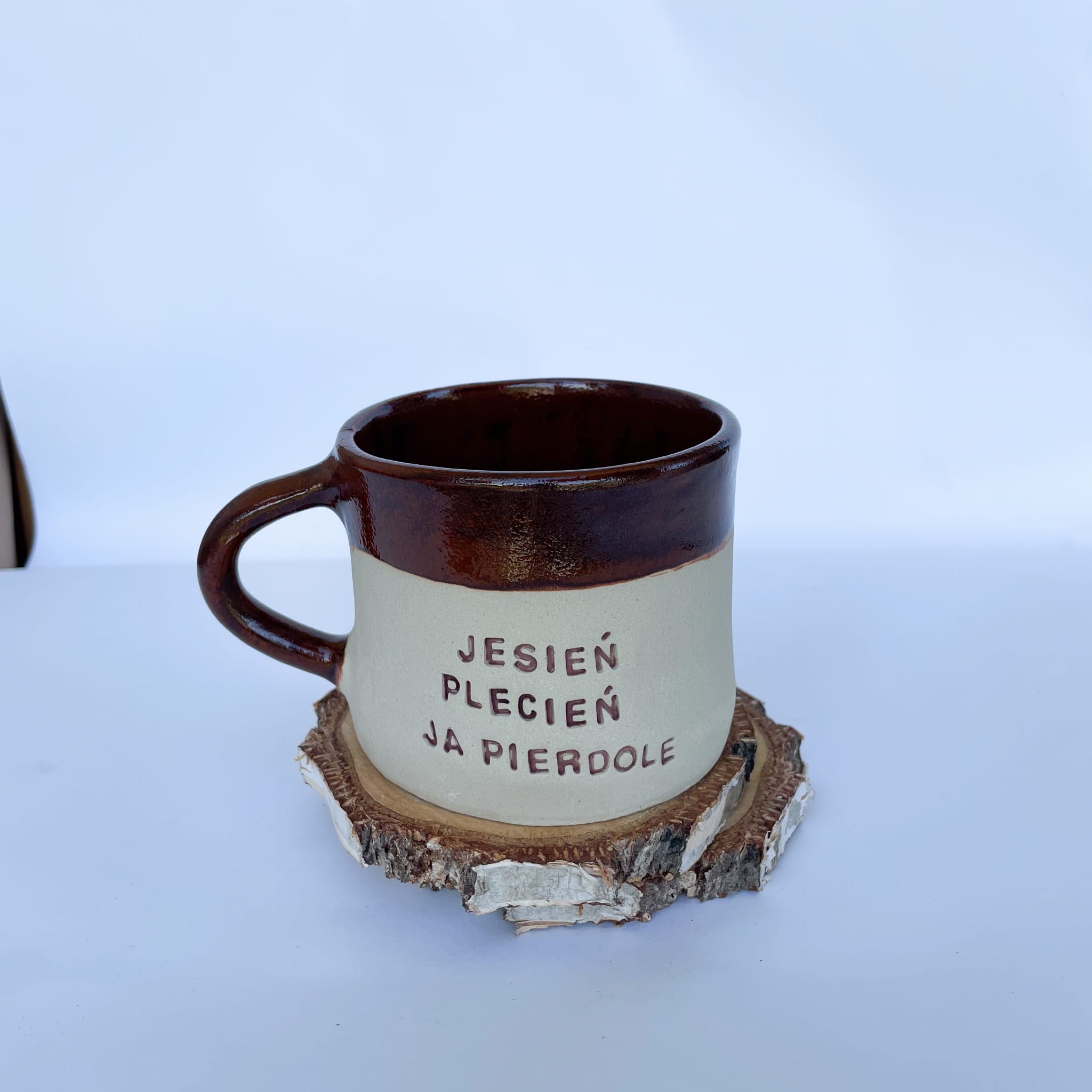 Ceramiczny kubek w odcieniach naturalnej gliny i ciepłego brązu. Surowy, minimalistyczny i z charakterem. Zabawny, ironiczny napis nadaje mu pazura, a wygodne ucho i idealna pojemność sprawiają, że będzie ulubionym towarzyszem jesiennych poranków.