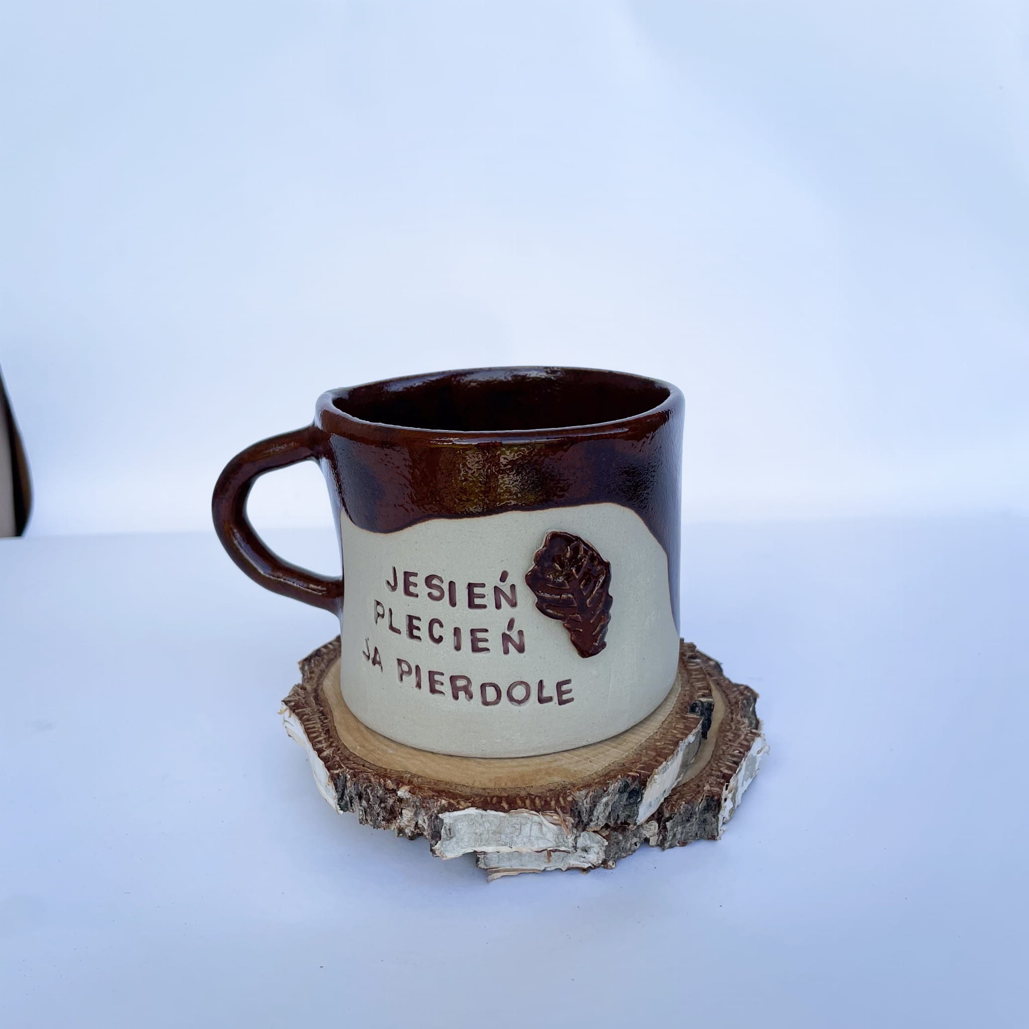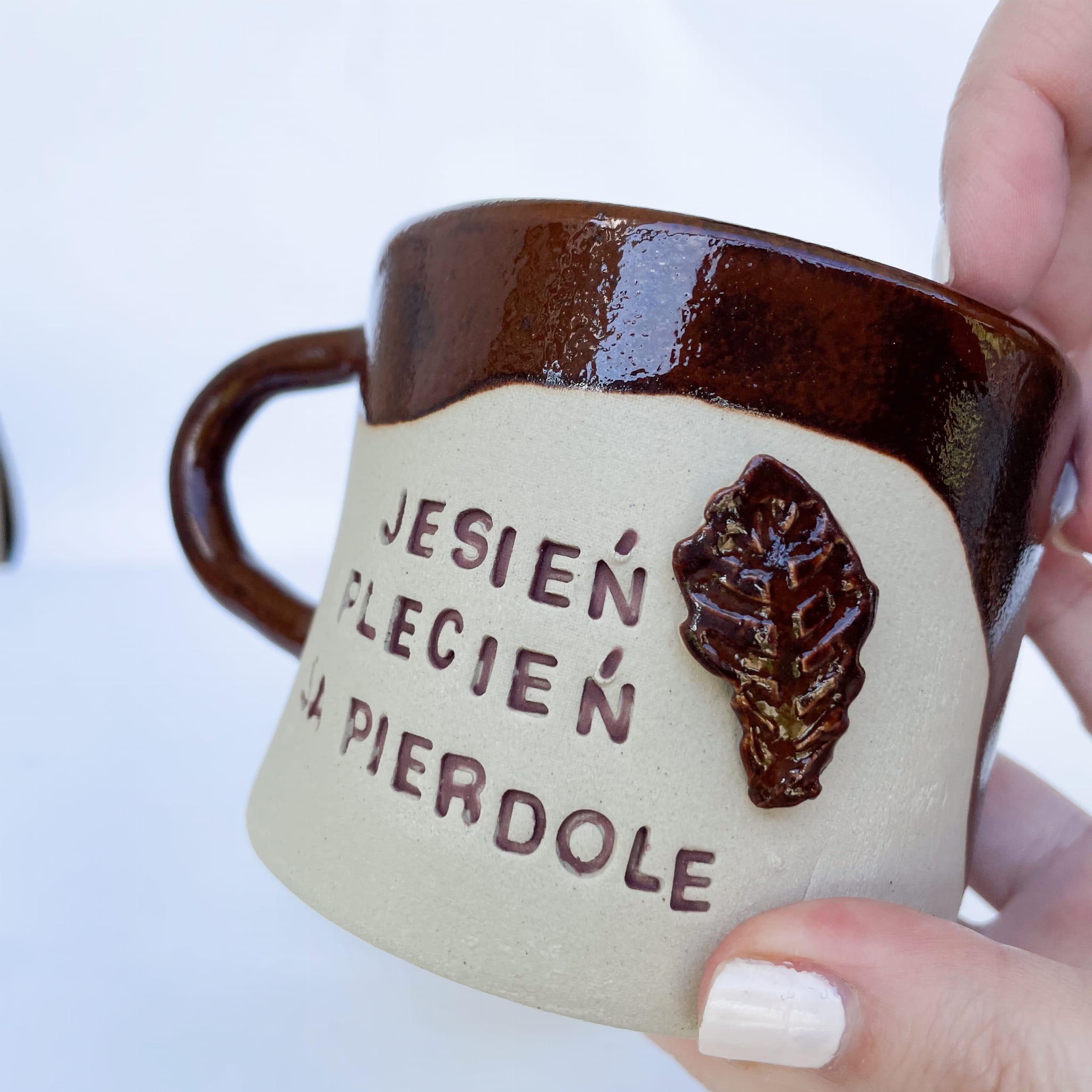 Ręcznie robiony kubek z charakterem. Połączenie szkliwienia w ciepłym brązie z naturalnym beżem oraz napis „Jesień plecień, ja pierdolę” dopełnia ceramiczny detal – listek. To kubek, który będzie nie tylko praktycznym naczyniem, ale i zabawną dekoracją. Idealny dla fanów unikalnych, odważnych dodatków.