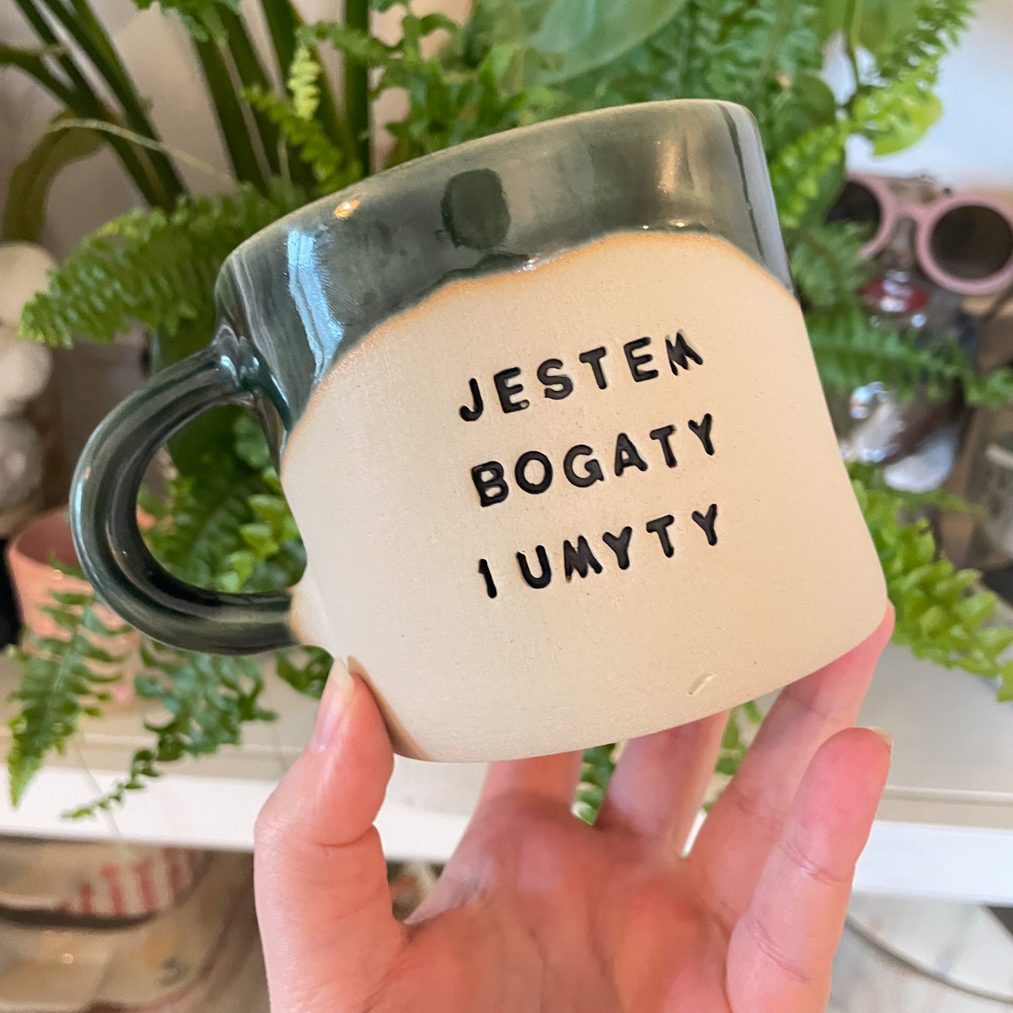 Ten kubek powstał ręcznie, z kamionki, z myślą o codziennych małych afirmacjach podanych bez patosu. Napis „Jestem bogaty i umyty” to lekki żart, który działa zaskakująco dobrze – szczególnie przed pierwszą kawą.