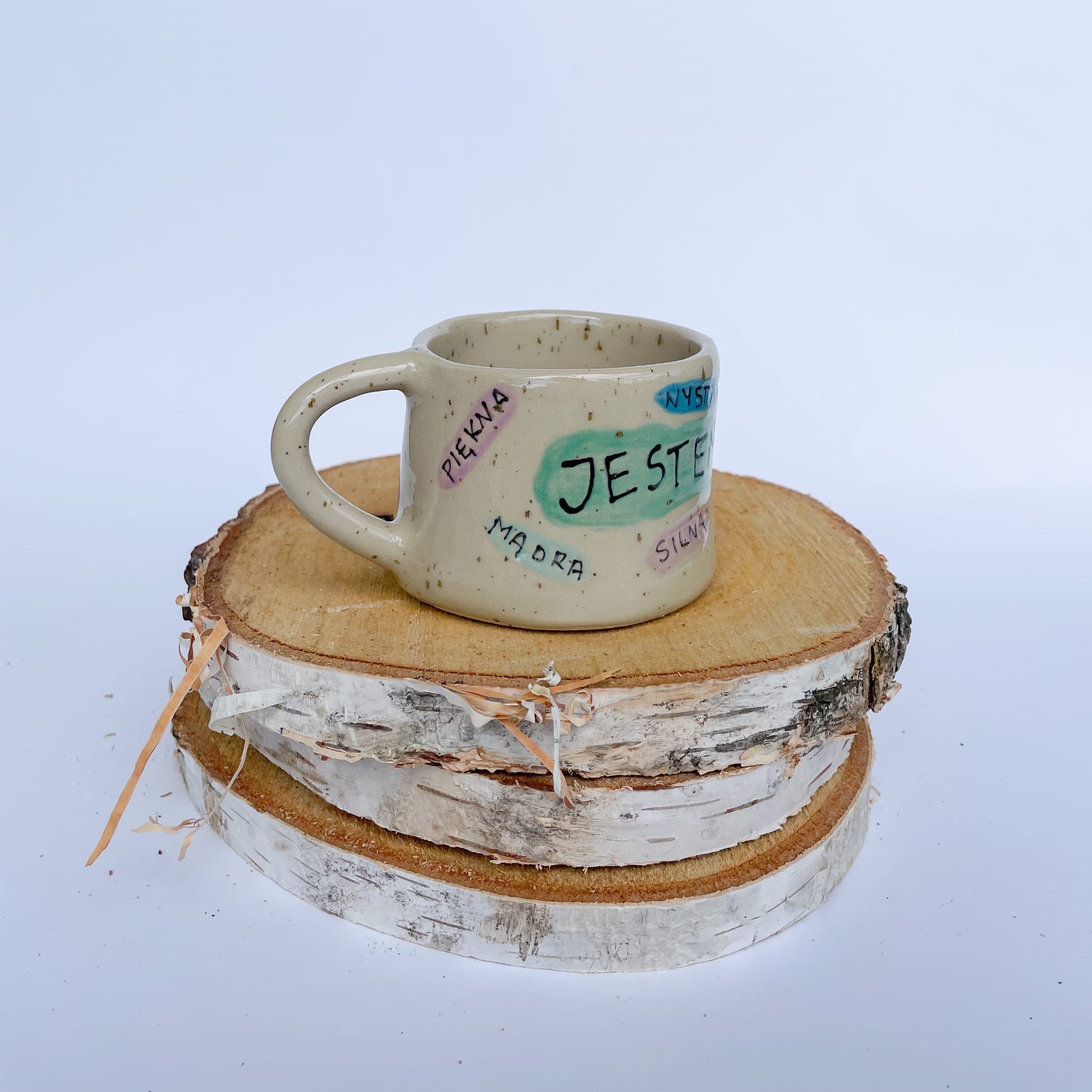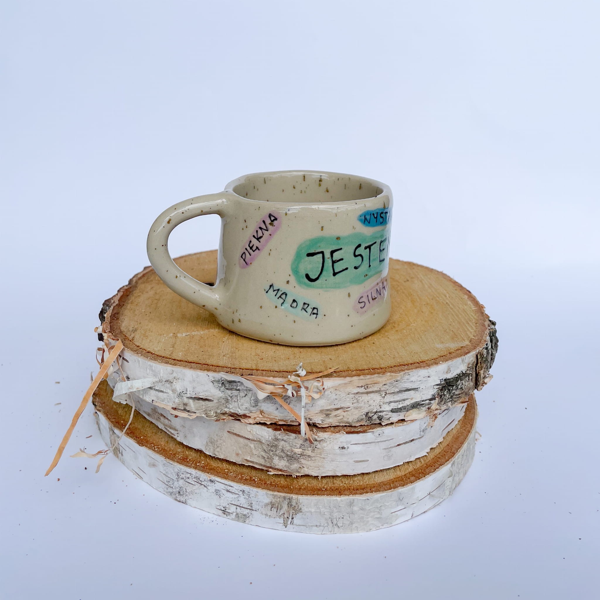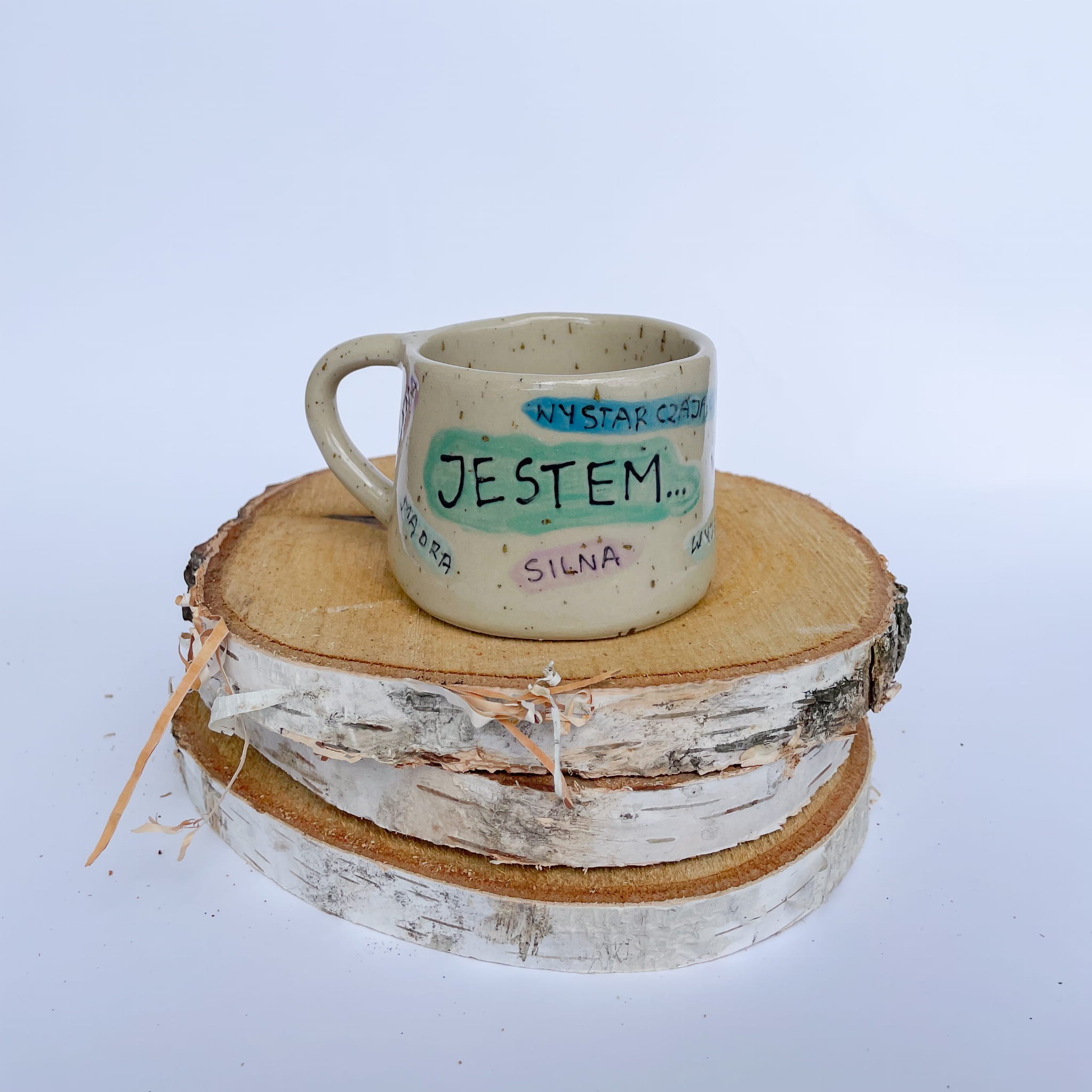 Mieści około 200 ml Twojego ulubionego napoju, a jego powierzchnię zdobią ręcznie malowane, kolorowe hasła pełne ciepła i motywacji – „piękna”, „wyjątkowa”, „inspirująca”, „wartościowa” i wiele innych.