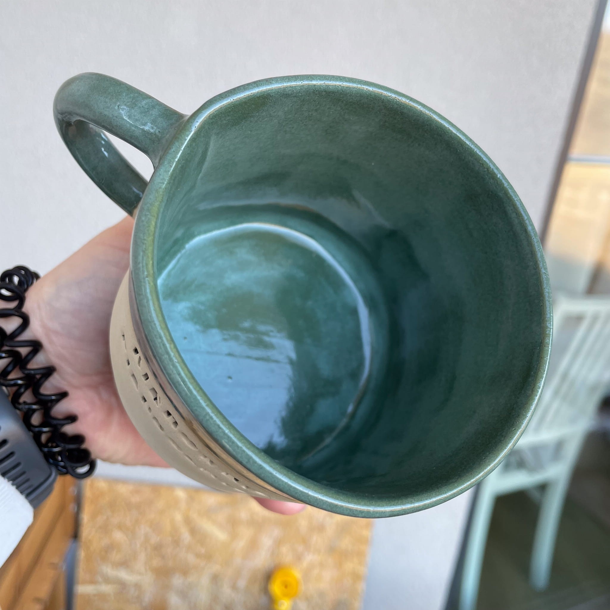 Kubek jest w całości wykonany ręcznie w pracowni ceramicznej. Naturalna glina, minimalistyczna forma i szkliwo spływające po ściankach nadają mu charakterystyczny, surowy styl.