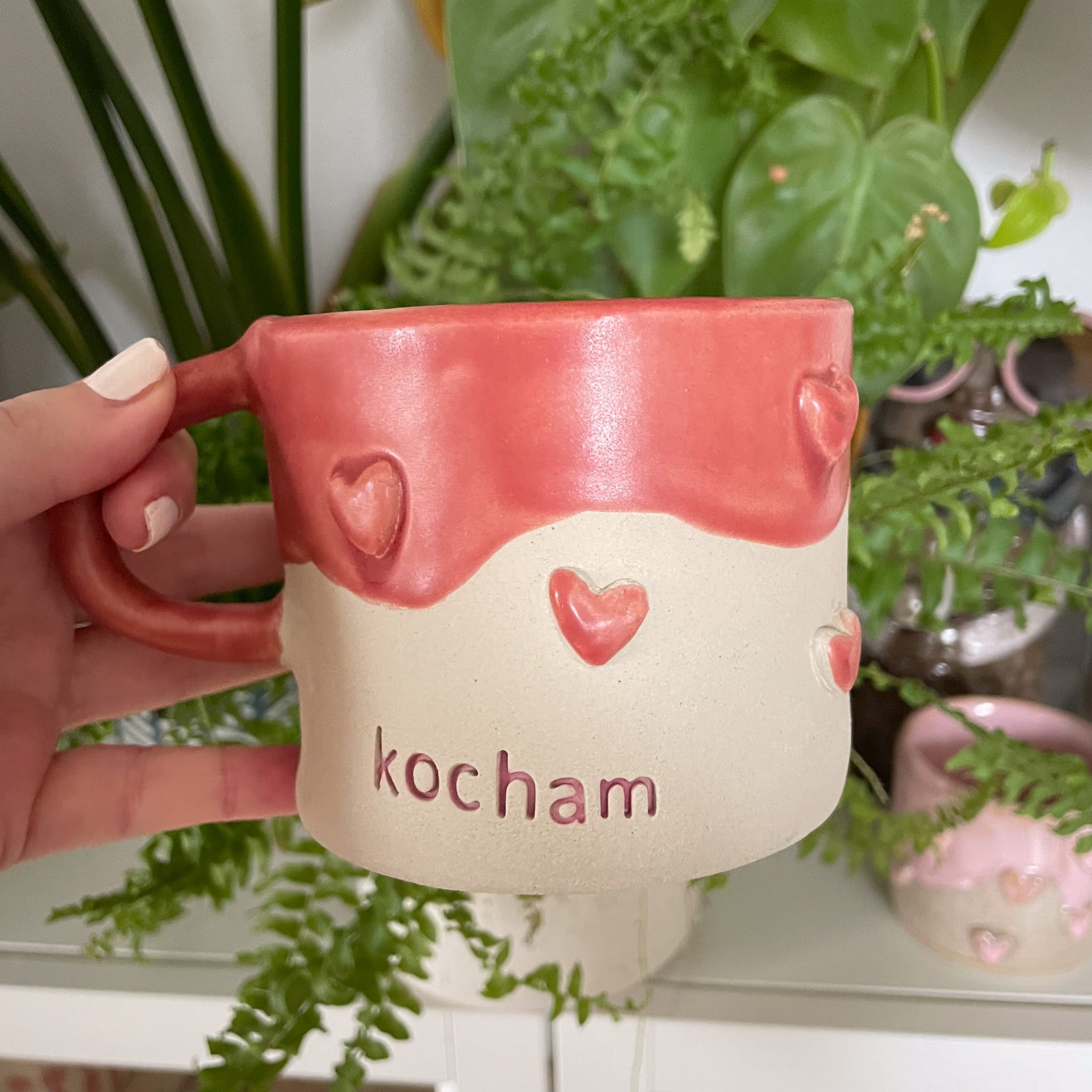 Kubek „Kocham” to wyjątkowy, ręcznie wykonany ceramiczny kubek, który w prosty sposób przekazuje najważniejsze emocje. Napis oraz ceramiczne serduszka zostały wykonane ręcznie, dzięki czemu każdy egzemplarz jest jedyny w swoim rodzaju i niepowtarzalny.