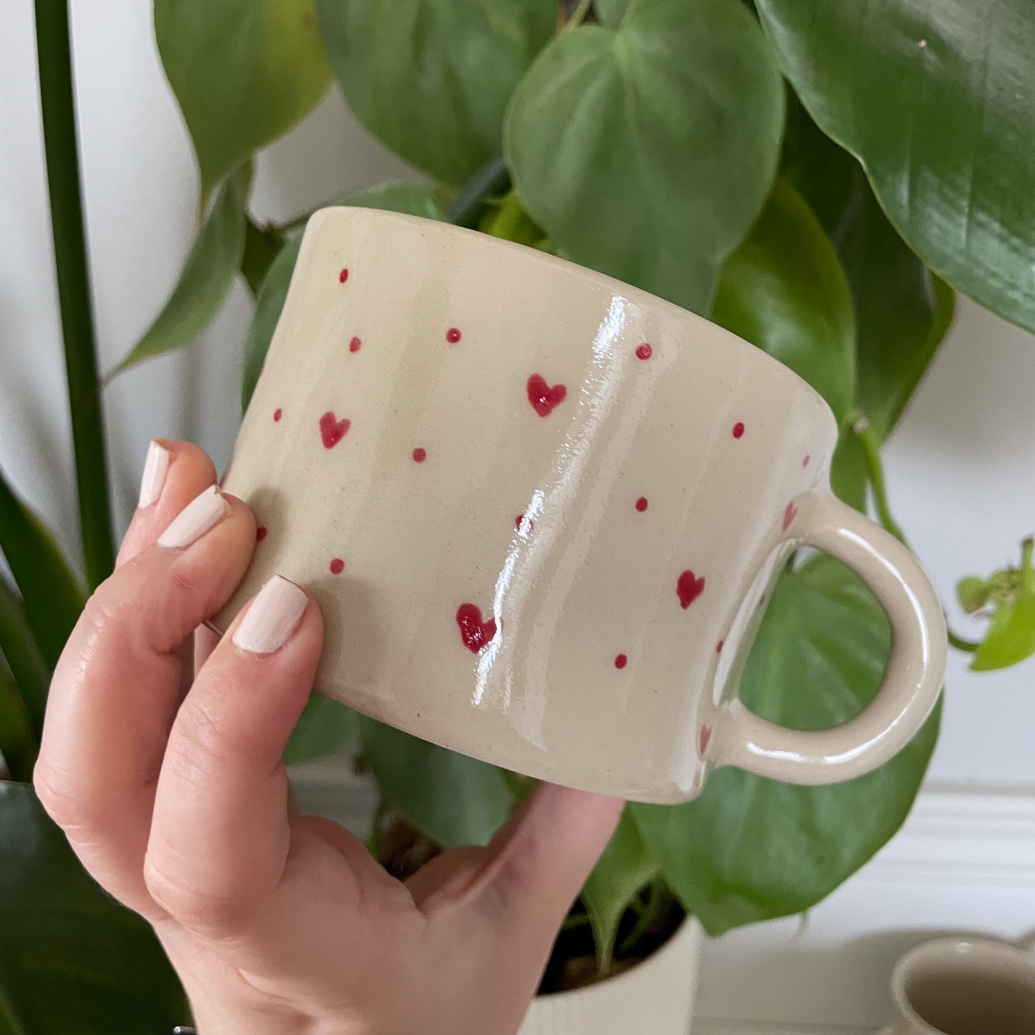 Ten kubek to czysta radość i odrobina bajki w codzienności. „Kubek Księżniczki” został ręcznie wykonany z gliny kamionkowej, wypalony w wysokiej temperaturze i pokryty szkliwem o naturalnym połysku. Wzór tworzą tłoczone litery i ręcznie malowane czerwone serduszka – każdy egzemplarz jest unikalny.