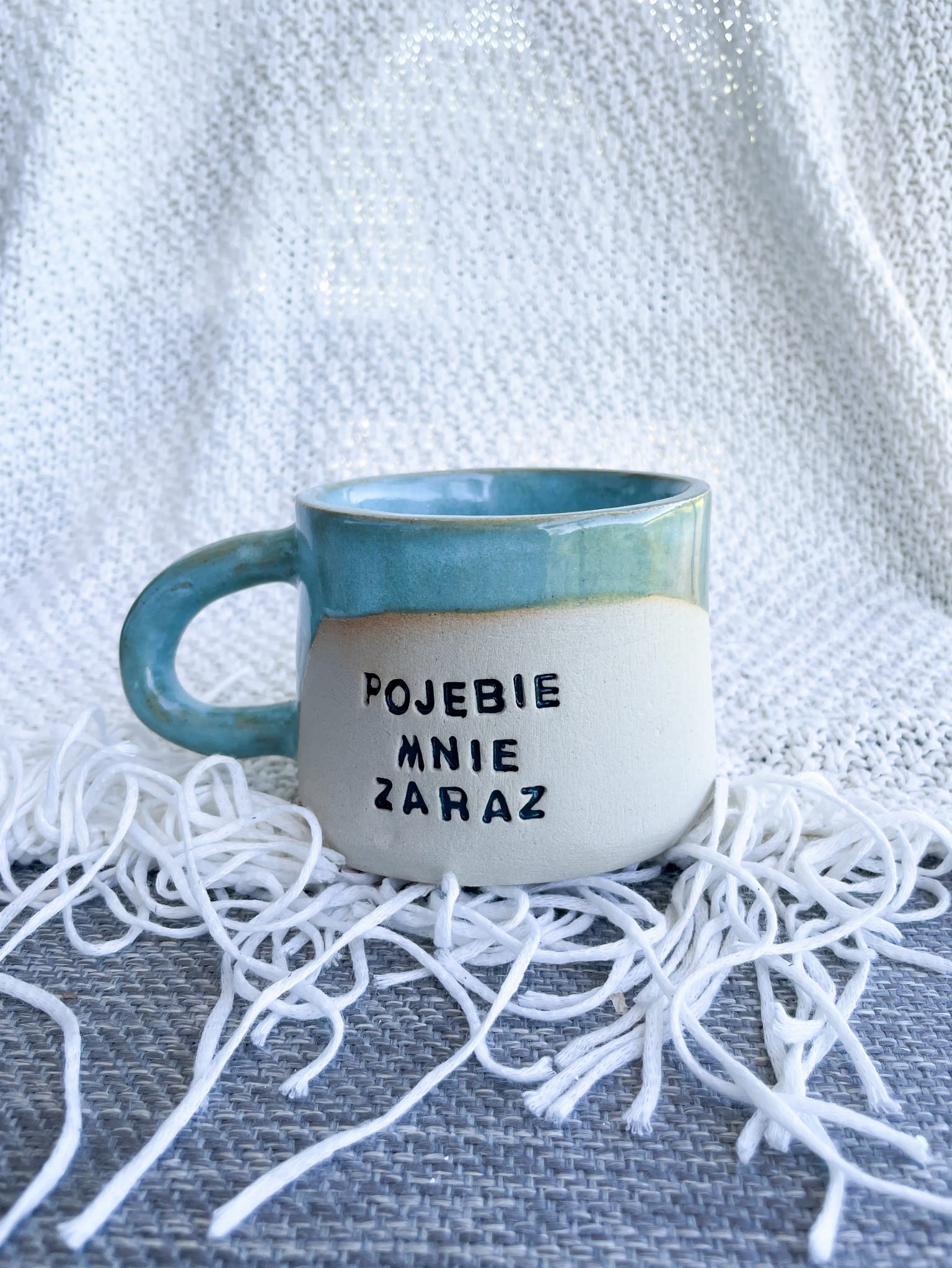 Kubek "Pojebie mnie zaraz" to ręcznie wykonany ceramiczny manifest wszystkich tych dni, kiedy cierpliwość kończy się szybciej niż kawa w filiżance. Niezwykła kombinacja spokojnych, błękitno-zielonych szkliw z odważnym napisem tworzy naczynie pełne humoru i szczerości.