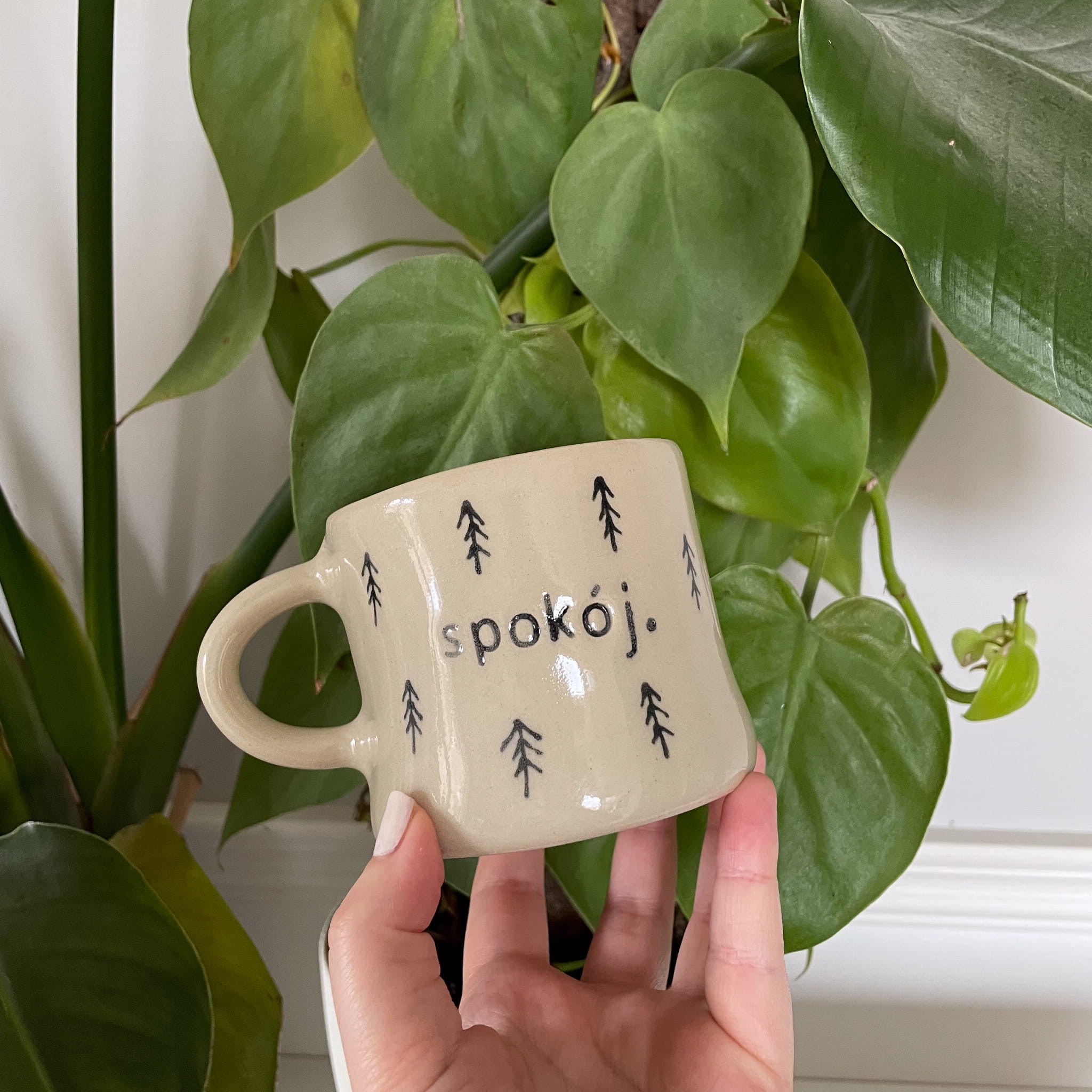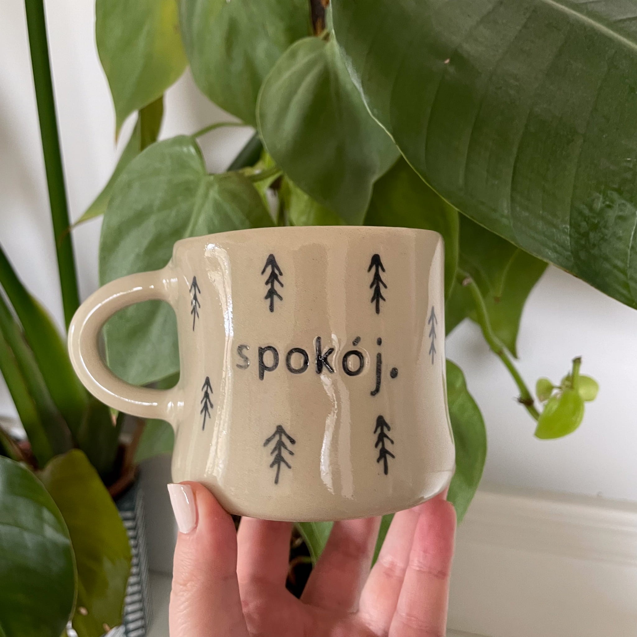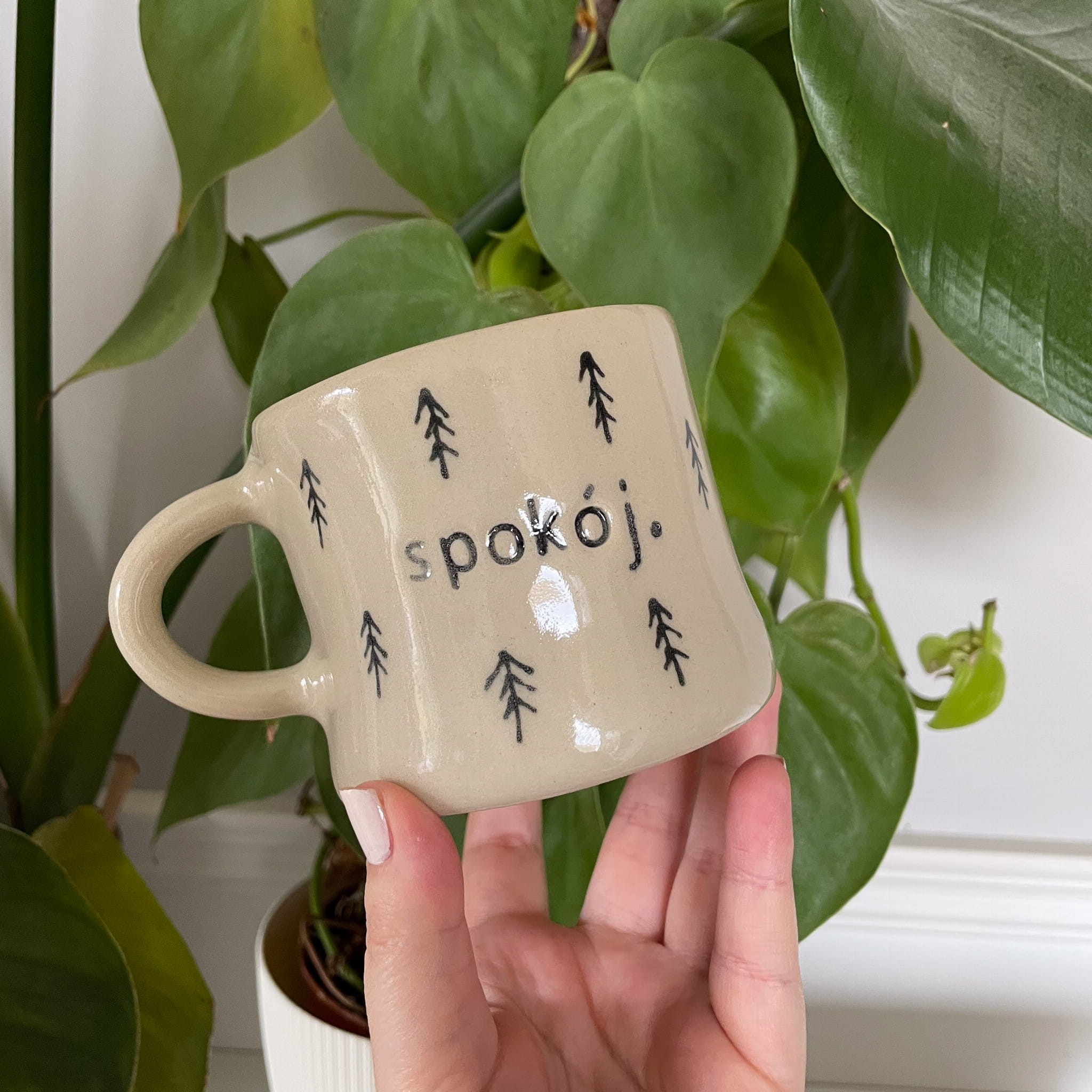 Drobne rysunki drzew wokół kubka nawiązują do leśnej przestrzeni, a napis „spokój.” przypomina o tym, co w życiu najważniejsze. Każdy kubek jest unikalny – różnice w odcieniach i strukturze są naturalne dla ceramiki handmade i stanowią jej największy urok.