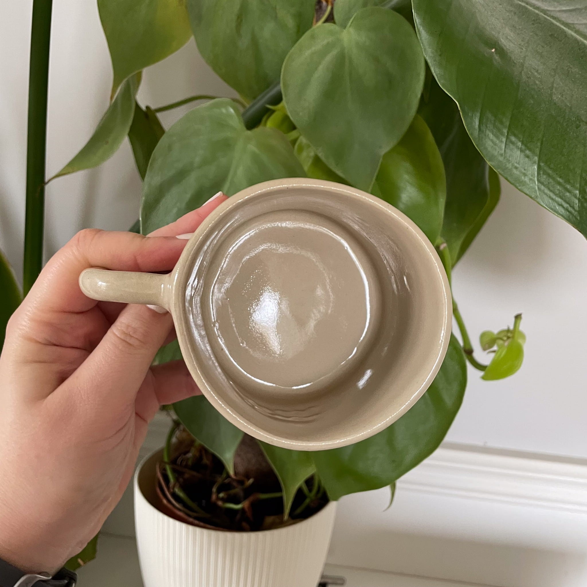 Każdy kubek jest niepowtarzalny, a jego prosty, surowy design łączy się z zabawnym napisem, tworząc coś, co z miejsca wywołuje uśmiech.