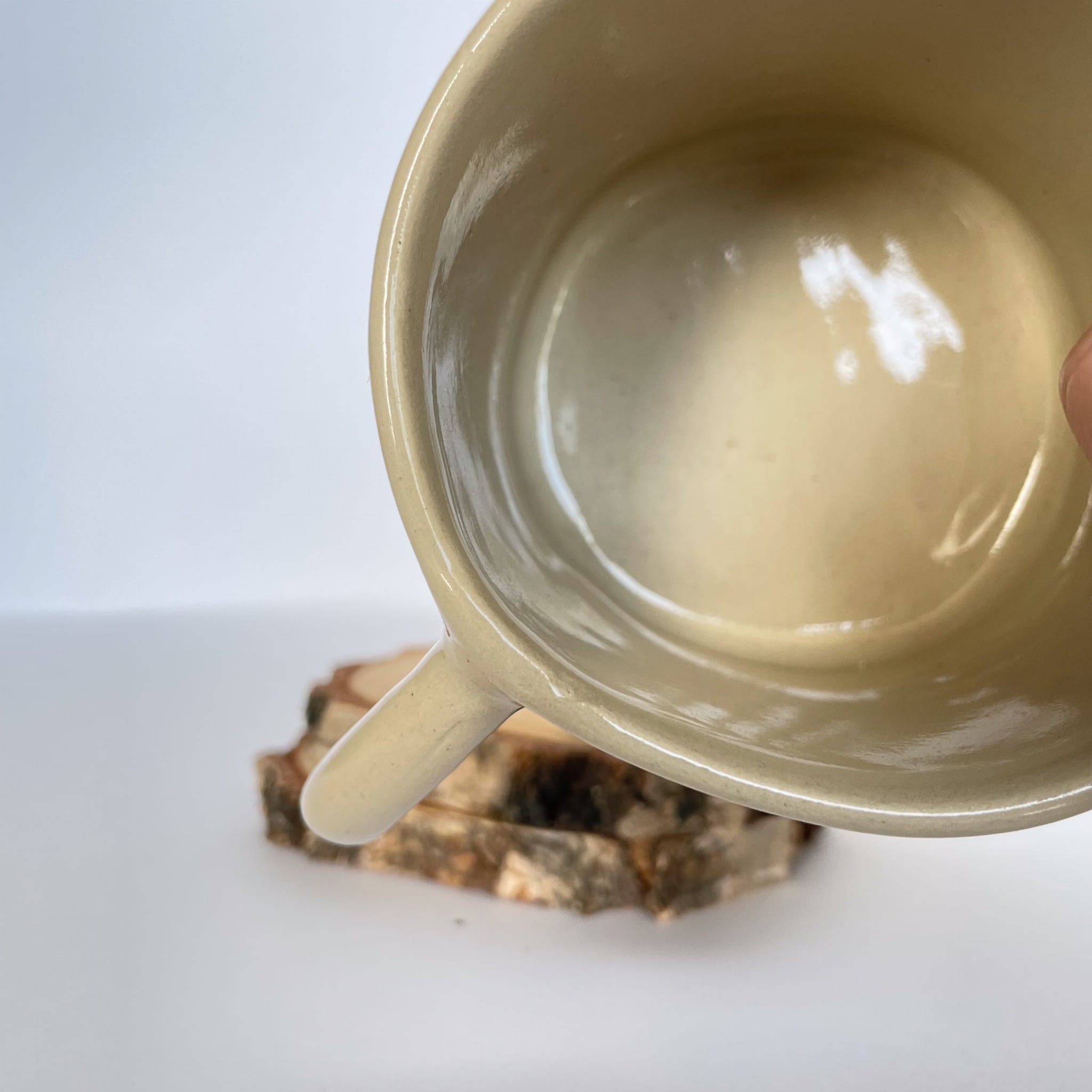 Posiada drobne "obicie" obok ucha. Obicie jest pod szkliwem, więc rant jest gładki i bezpieczny do użycia. Jest to tylko drobny defekt estetyczny