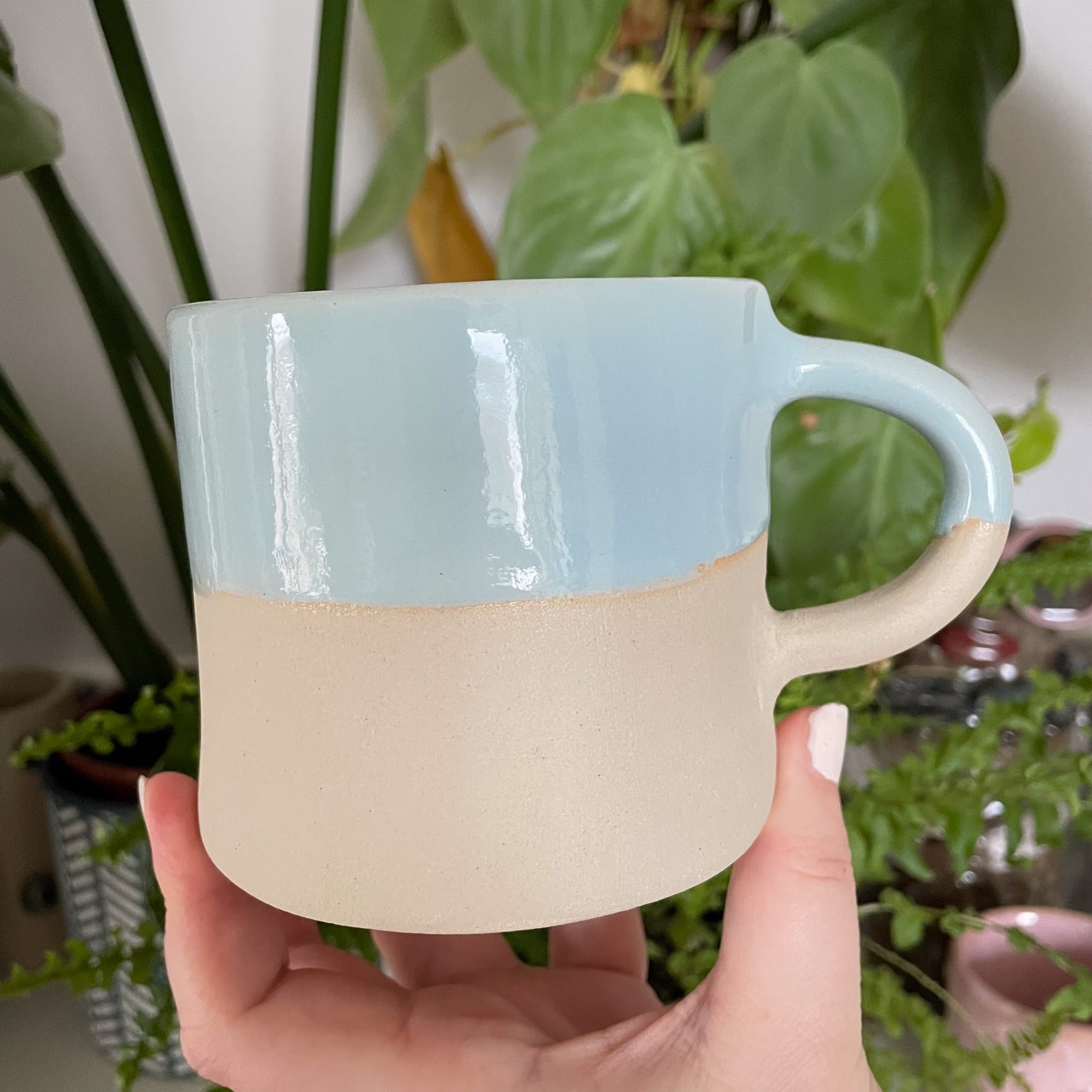 Każdy kubek powstaje w całości ręcznie – od formowania po szkliwienie – dlatego nie istnieją dwa identyczne egzemplarze. Delikatne przejście naturalnej gliny w chłodny błękit szkliwa oraz subtelna typografia tworzą spokojną, minimalistyczną kompozycję typową dla estetyki GLIFY.
