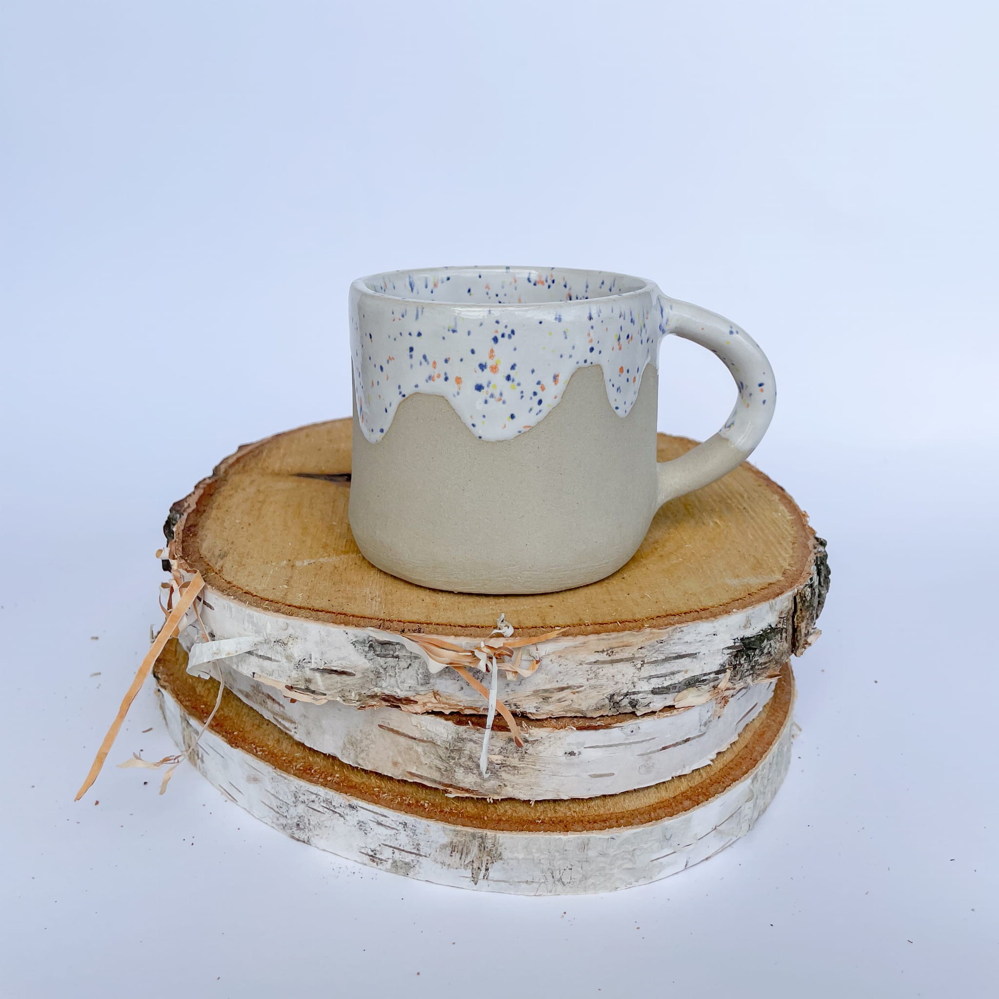 Kubek „Zakalec” to pełen uroku, ręcznie wykonany produkt z wysokiej jakości gliny. Beżowa, matowa baza została uzupełniona efektownym, białym szkliwem z kolorowymi kropeczkami, które spływa w nieregularnych falach, przypominając lukier na świeżo upieczonym cieście.