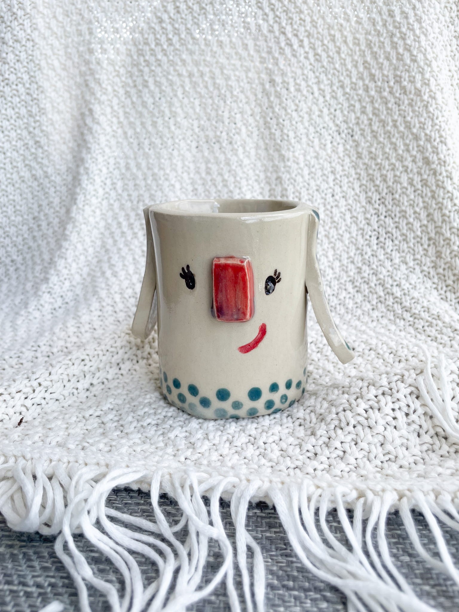 Flakon „Panna Kropka” to ceramiczna postać, która wygląda, jakby właśnie wybiegła z bajki – z rozbrajającym uśmiechem, zalotnymi rzęsami i uroczą sukienką w turkusowe kropki. Ręcznie wykonany z dbałością o detale, z rączkami po bokach i czerwonym noskiem, który trudno przegapić.