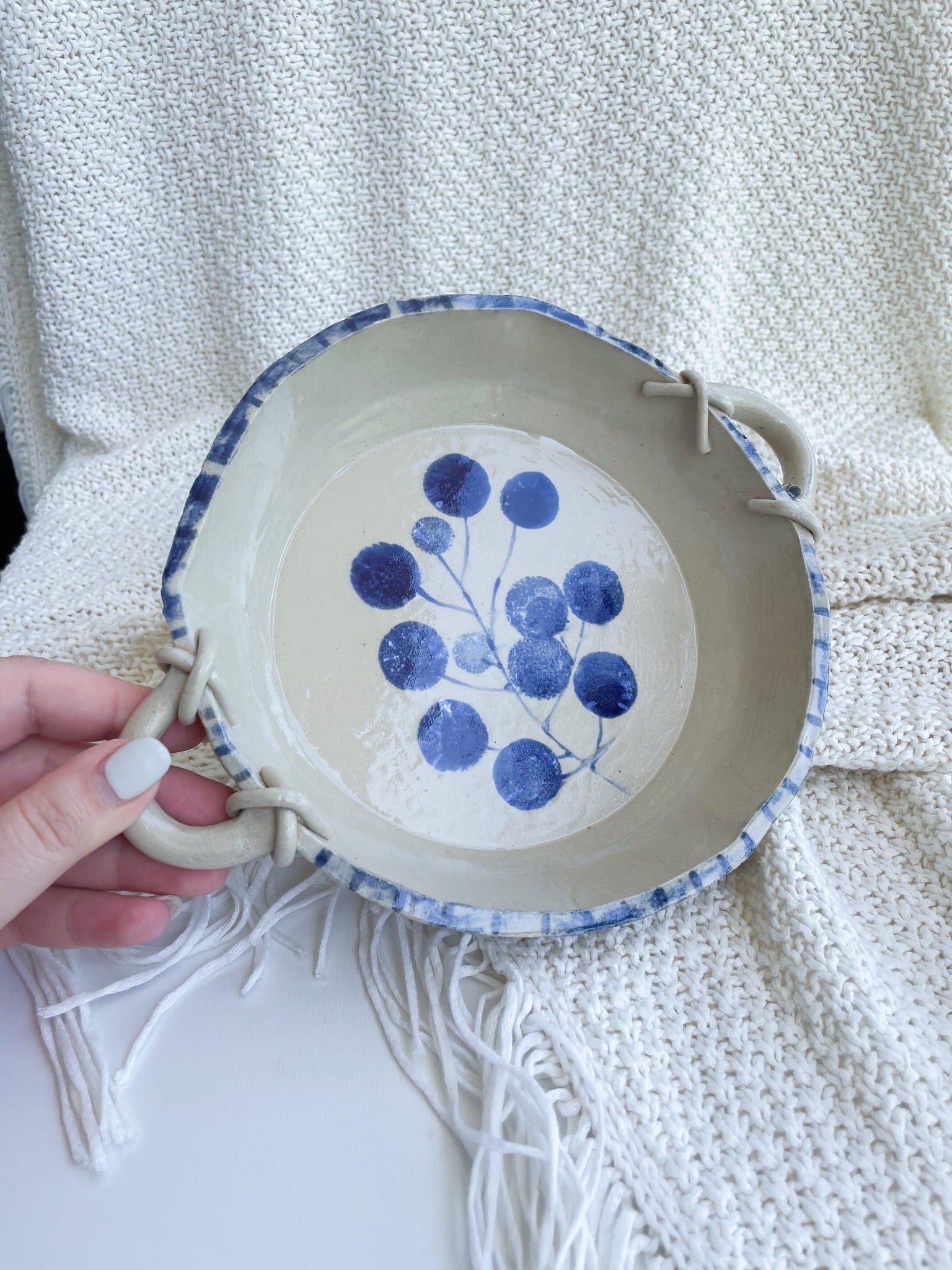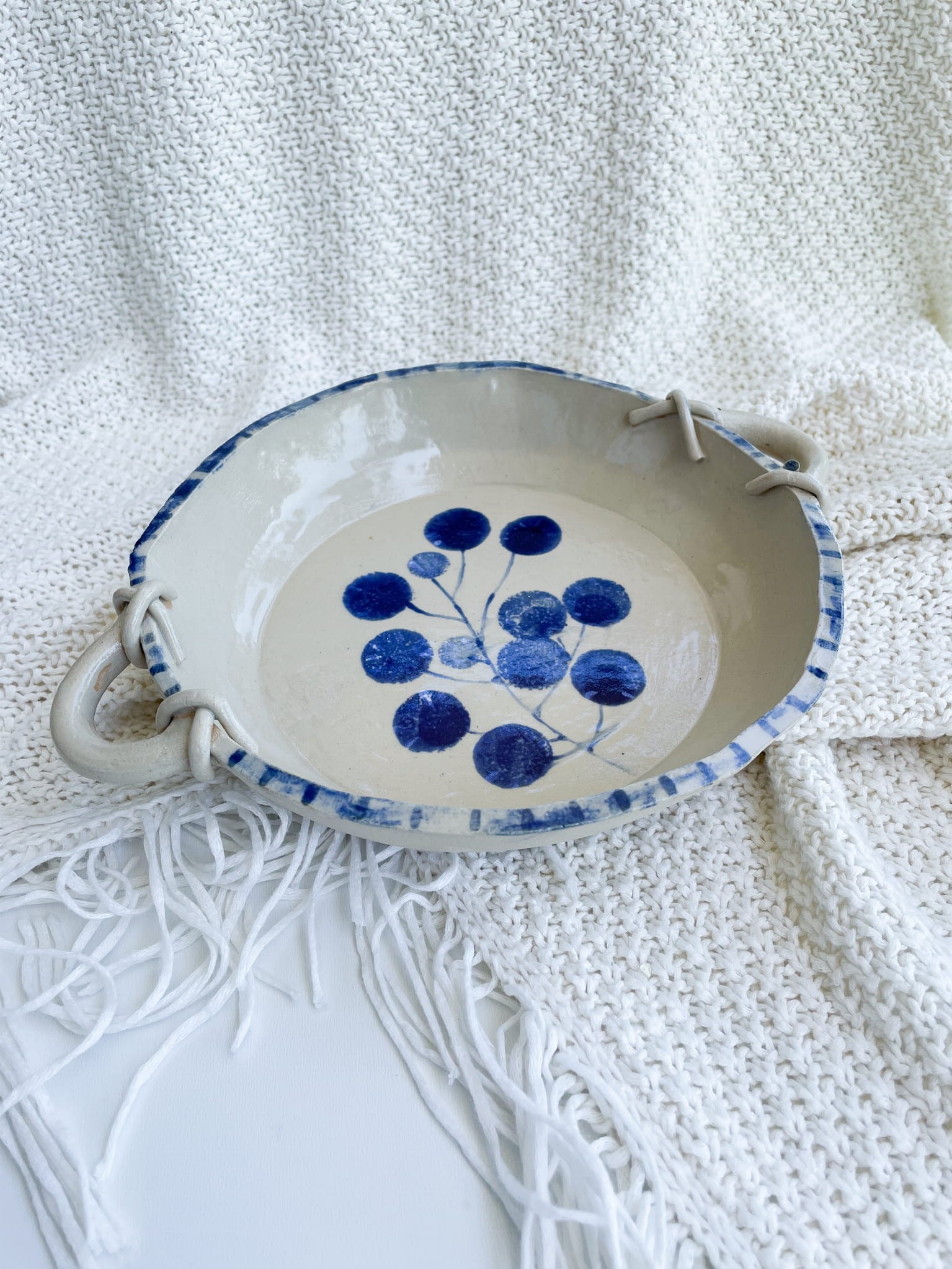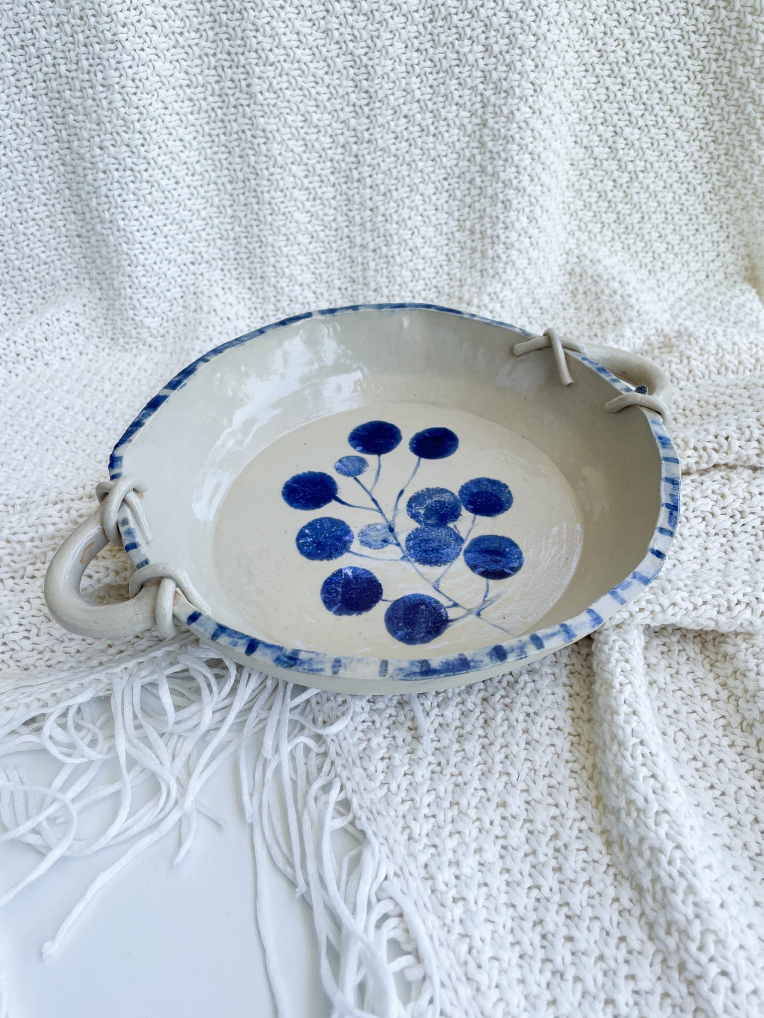 Rustykalna miska z niebieskim wzorem jagódek i sznurkowym motywem na brzegach. Urokliwa, praktyczna i totalnie „do zakochania”!