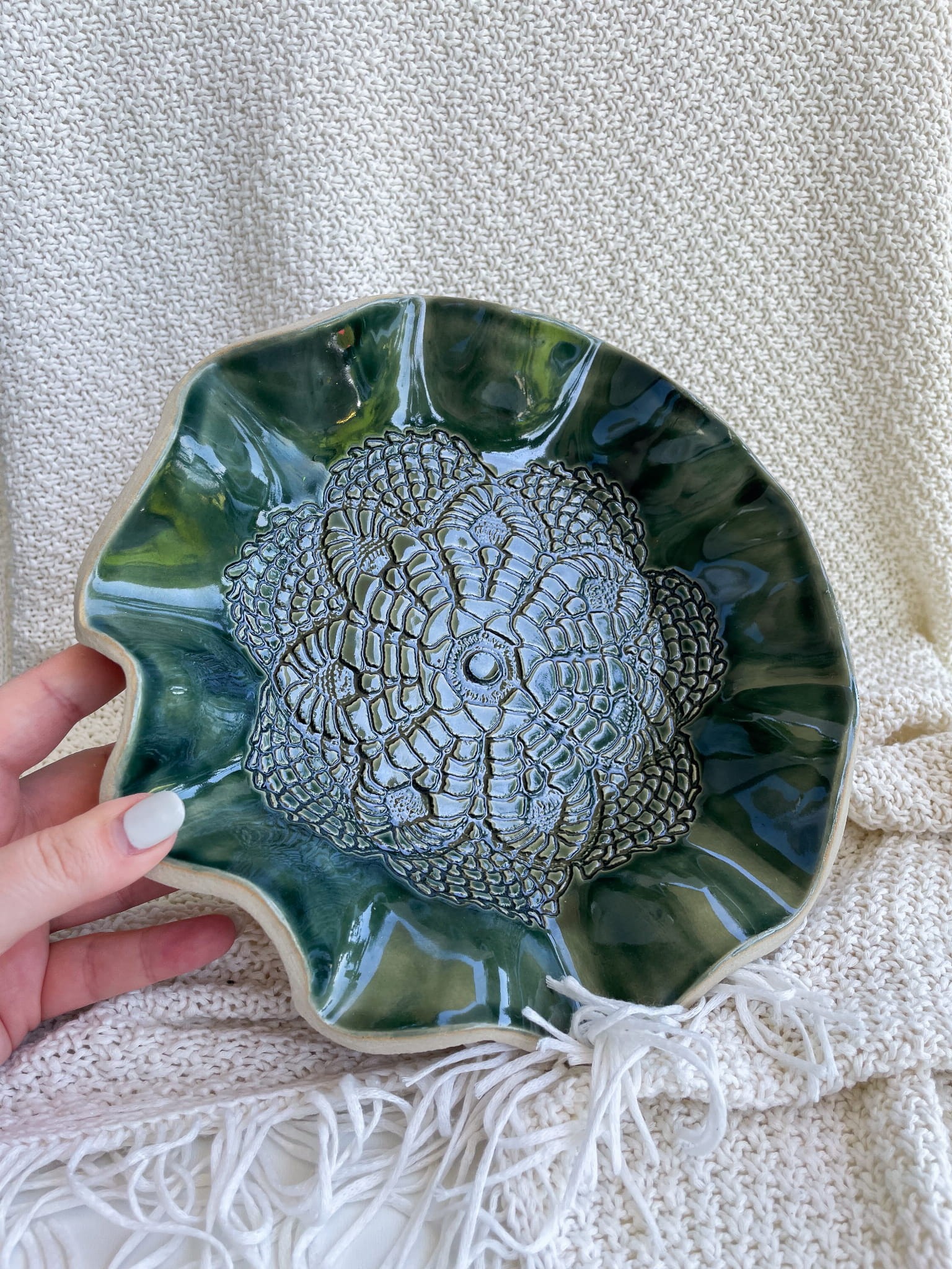 Z zewnątrz – harmonijnie pofalowane brzegi, jakby miska zatańczyła walca z wiatrem. W środku – głęboka zieleń, która przywodzi na myśl gęsty las po deszczu. A pośrodku? Koronkowe arcydzieło! Wzór jak z babcinej serwety, tylko że wiecznie żywy, uwieczniony w glinie i szkliwie.