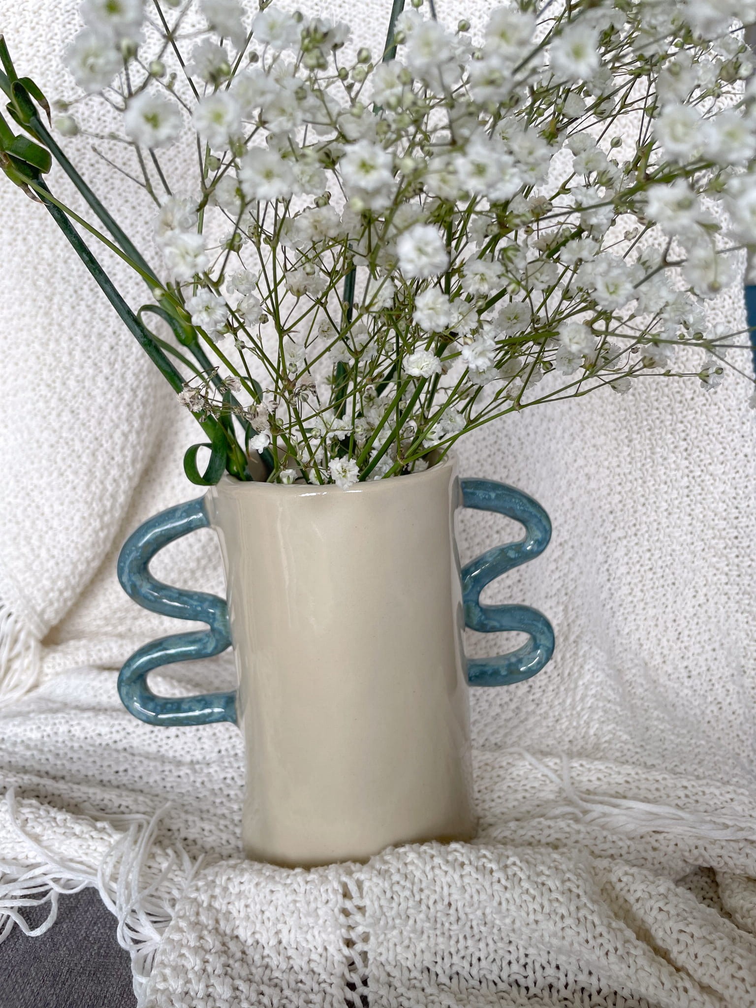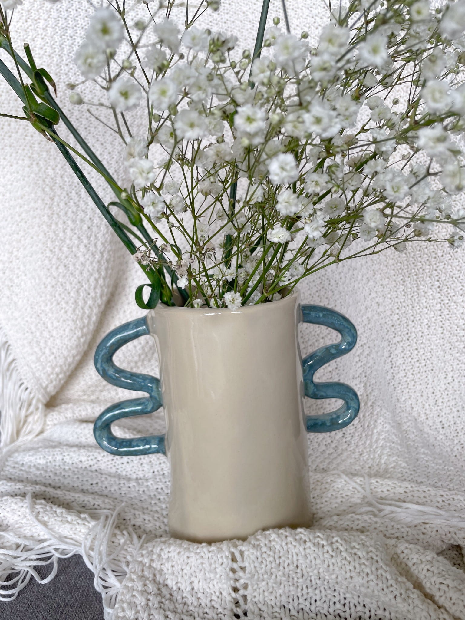 „Fala” to unikatowy wazon ceramiczny, który łączy nowoczesny minimalizm z artystyczną fantazją. Jego gładki, kremowy korpus został zestawiony z nietypowymi uchwytami w kształcie fal, szkliwionymi na błękitno – niczym odbicie wody w szklanej tafli. To wyjątkowy akcent dekoracyjny, który przyciąga wzrok i nadaje wnętrzu indywidualnego charakteru.