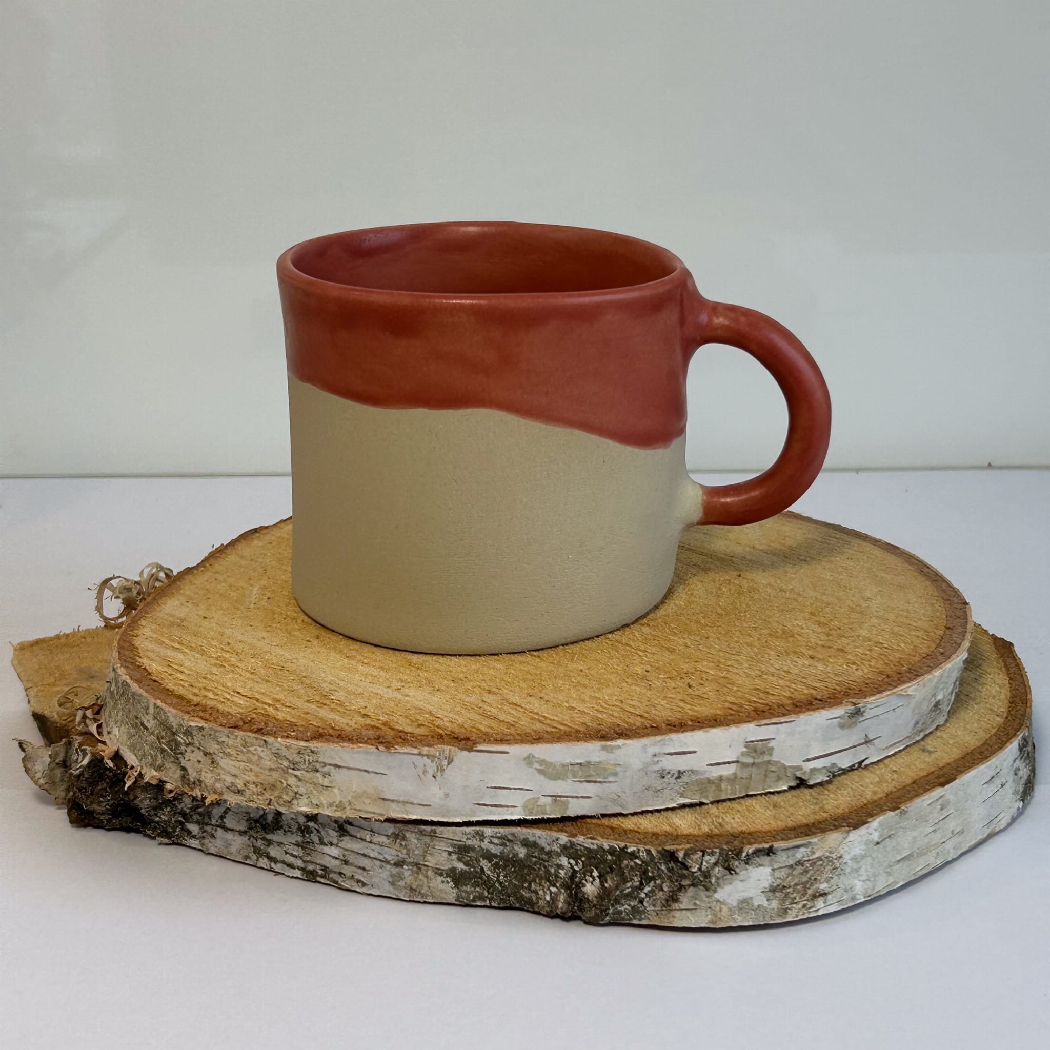 Kubek został wykonany ręcznie z gliny i wypalony w wysokiej temperaturze. Górna część pokryta jest szkliwem w ciepłym, ceglastym odcieniu, które naturalnie spływa i układa się inaczej na każdym egzemplarzu. Dzięki temu każdy kubek jest unikatowy – drobne różnice w kształcie, kolorze czy fakturze są naturalnym efektem ręcznej pracy.