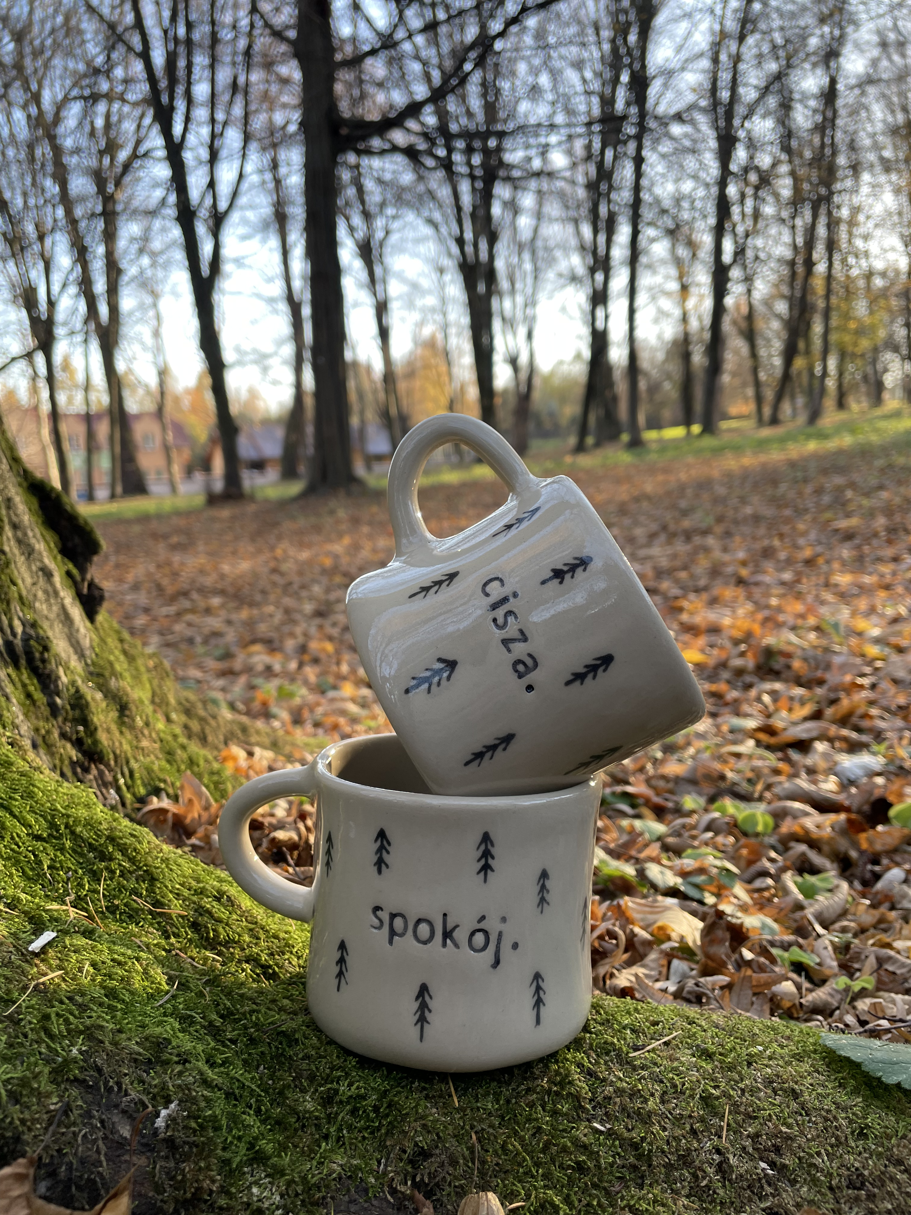 Minimalistyczny wzór drobnych drzewek przywołuje zapach lasu i spokój poranka wśród natury. Napisy „cisza.” i „spokój.” są subtelnym przypomnieniem, by zwolnić i znaleźć chwilę dla siebie — z kubkiem ulubionej kawy lub herbaty w dłoniach.