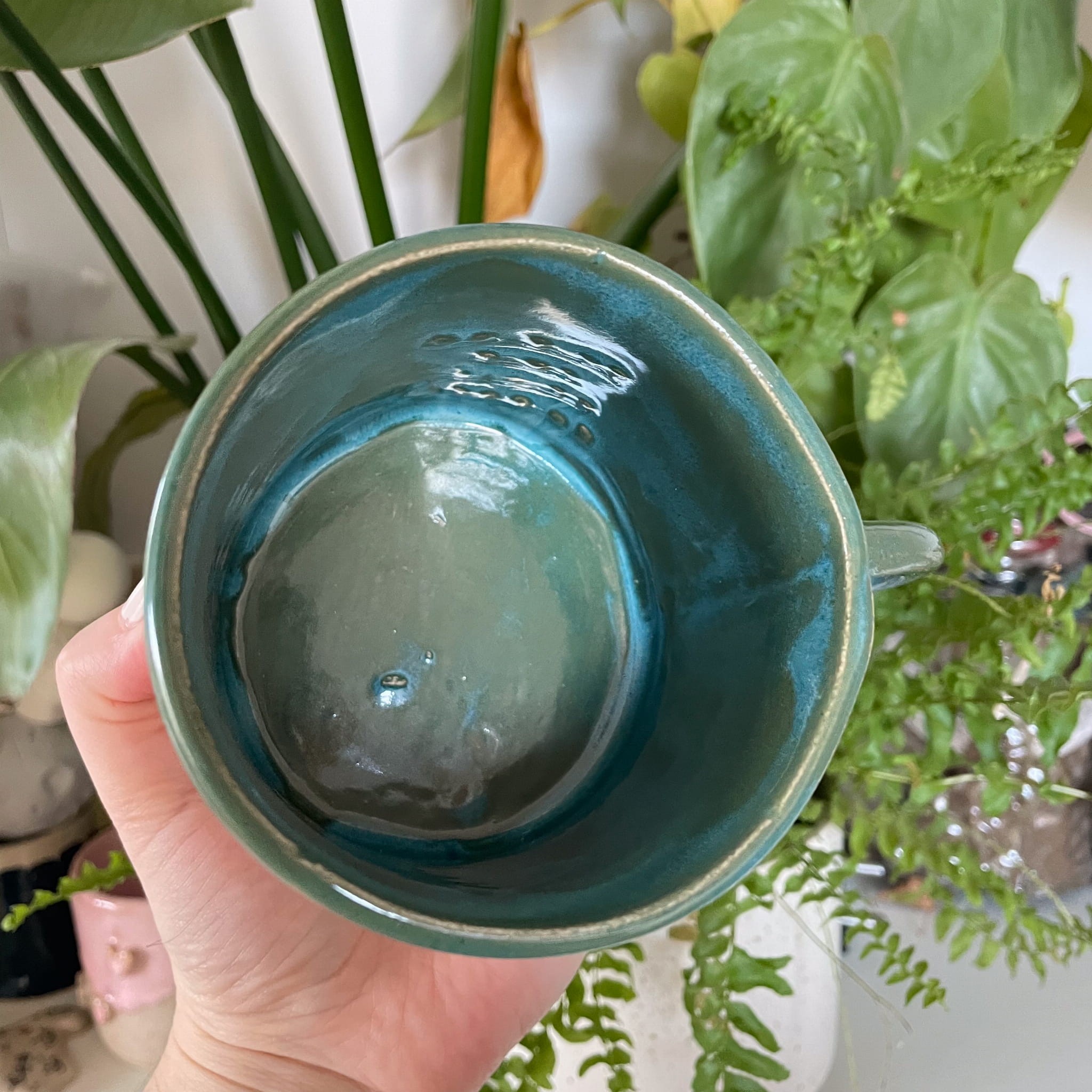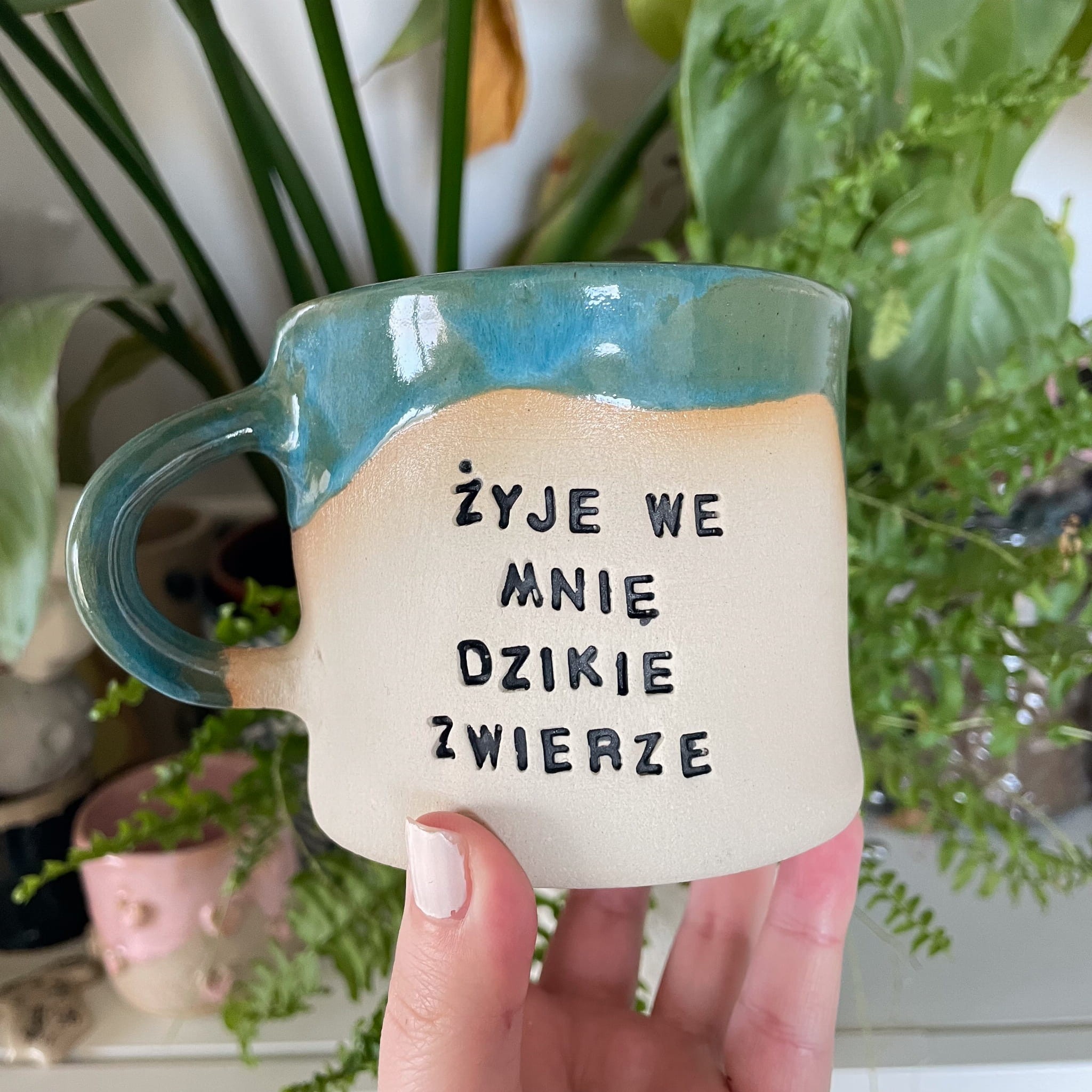 Każdy egzemplarz powstaje w całości ręcznie: od uformowania naczynia, przez stemplowanie liter i ręczne malowanie ilustracji, aż po szkliwienie i wypał. Naturalna kremowa glina kontrastuje z chłodnym, turkusowym szkliwem górnej części kubka oraz delikatnymi akcentami roślinnymi wokół ilustracji. Dzięki ręcznej pracy każdy kubek posiada drobne różnice w fakturze i kolorze – każdy jest unikatowy.